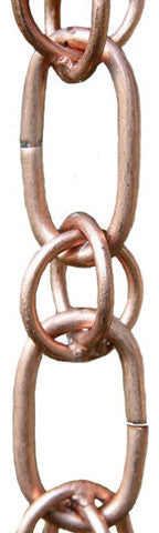 This link chain, in pure solid copper, features a Link & Loop inset into the chain. This design provides for excellent water flow. Exclusive design by Garm Beall. This chain is sold by the linear foot. Comes with our recommended accessory: 3" Copper Installation Kit.If you??re looking for a charming solution to ridding your roof of water, rain chains are an elegant alternative to the more traditional gutter downspout. These whimsical chains guide water from your roof down to the ground in loops or cups. The combination of water happily trickling down plus the fun and intricate designs of the cups and loops make a rain chain a fascinating water feature that??s easy to add to any home.The rain chain originated in Japan, and if you happen upon a Japanese temple you may spot one gracefully guiding the water down to the ground or into a nearby rain barrel. Installation of rain chains at home is fairly simple as they hang from the hole where your downspout would have gone. If you prefer something more refined than a rain barrel, you can create a shallow bowl out of redwood or cedar and fill it with small pebbles or place a paver stone of your choice beneath your rain chains. Another option may be a ceramic or copper bowl, as well.SKU: RC3133-8Unfinished, pure copper.Link length: 2 1/2", width: 1 1/4", thickness: 3/16".Hand-crafted.Comes with a 3" Copper Installation Kit.A great addition and complement to copper gutters.Popular as an architectural element.Designed in the USA.Free Standard Shipping!