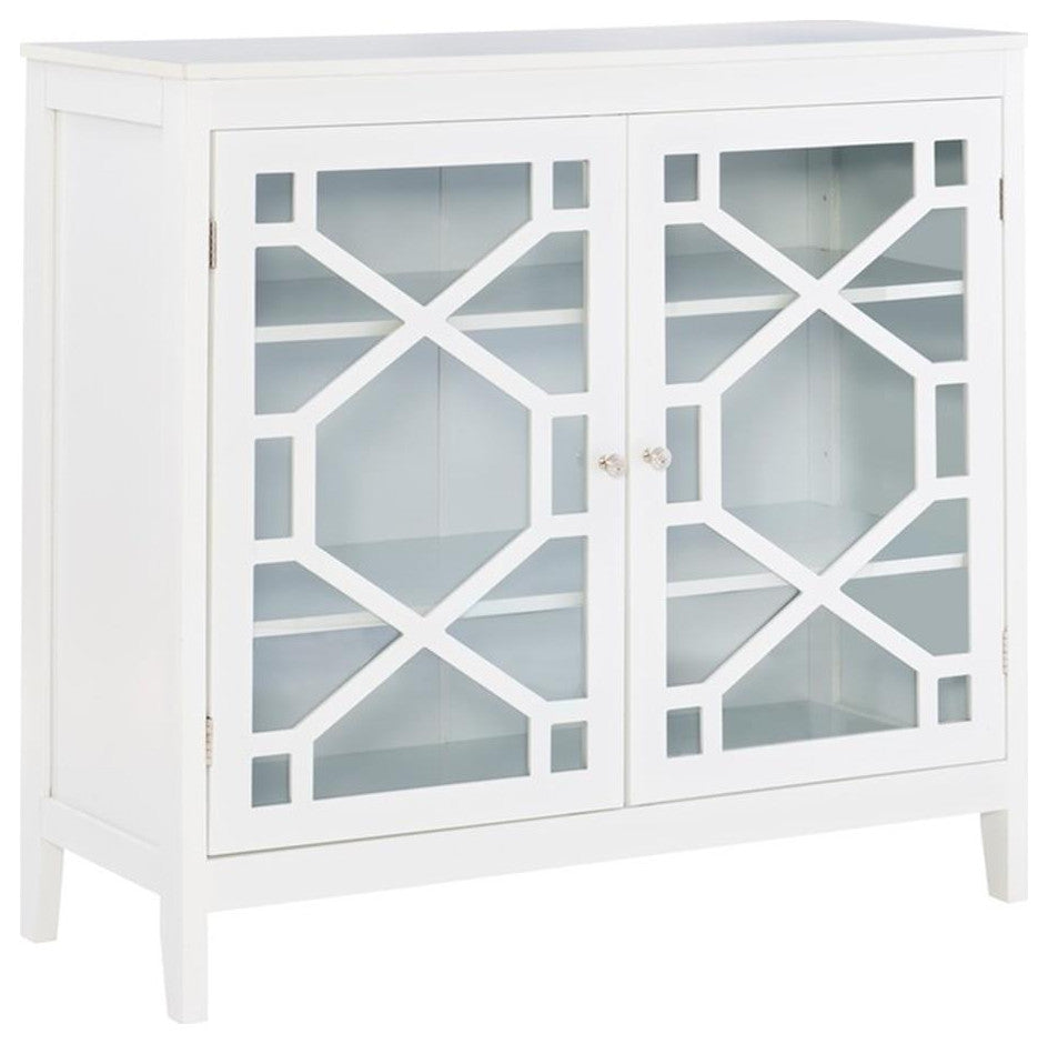 The Betty Large Cabinet is a versatile accent piece, fit for any room in your home. The cabinet features a double designed glass door front that adds interest and appeal to the streamlined frame. Inside, three shelves provide ample storage space for all of your essentials. Finished in a neutral white, the piece will easily complement any existing decor.Features: • Crafted from 80% MDF and 20% Tempered Glass • White Finish • Three interior shelves • Fun versatile accent piece • Eyecatching glass front • Sturdy and durable • Three Shelves: shelf dimensions: 35.75" x 13.5" • Two tempered glass paneled doors with decorative overlays • Chrome finished hardwareSpecifications: • Product Dimensions: 38"w x 15"d x 36.25"h • Product Weight: 63.95 lbs • Assembly Required: Some Assembly Required • Weight Capacity: Top: 100 lbs, Shelf: 25 lbs • Leg Dimensions: 4.25" high