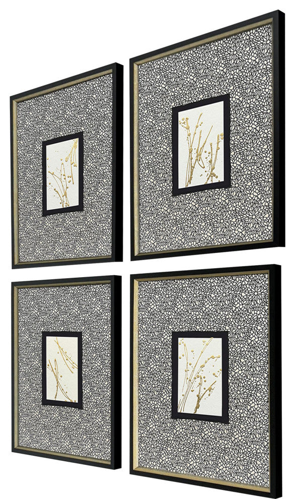 Exclusive hand painted with gold leaf on fine art paper and accented with decorative papers. Framed in a black painted wood with silver leaf slope.