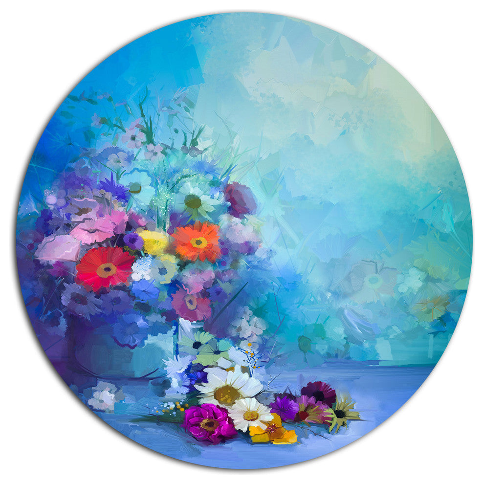 Bring Contemporary Abstraction to your home with this large Circle Metal wall art. This Little Flowers on Blue Background Metal Artwork makes it the focal point of any room or office.