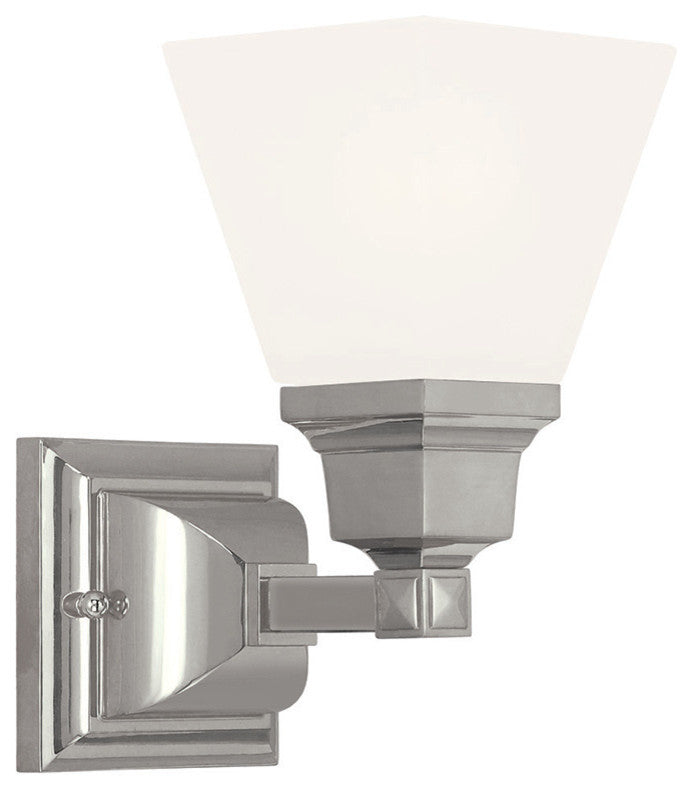 The Mission collection has clean lines with geometric forms. This one light bath fixture with etched opal glass is finished in polished nickel. Square bar style arms elevate the glass. Additional Product Information: Collection: Mission Item Finish: Polished Nickel Style: Transitional Glass/Shade Type: Satin Glass Width (inches): 5" Height (inches): 9.5" Extension (inches): 7.75" Number of Bulbs: 1 Bulb Base Type: Medium Base Max Wattage (Watts): 100 Backplate Size (inches): 4.5" Sq. Top to Mounting Height (inches): 7.5" H Suitable For Dry Locations?: Yes Suitable For Damp Locations?: Yes Suitable For Wet Locations?: No Can be Uplight or Downlight?: Yes Material: Steel Country: China