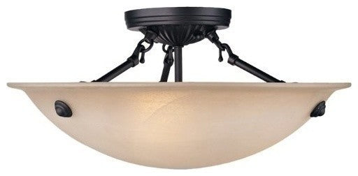 This semi flush features contour lines and a bowed profile. With an understated design, this piece is perfect for any space in your home. Featuring a honey alabaster glass and bronze finish, this fixture will effortlessly blend with your existing dcor. Additional Product Information: Collection: Oasis Item Finish: Bronze Style: Contemporary Glass/Shade Type: Honey Alabaster Glass Diameter (inches): 16" Height (inches): 7" Number of Bulbs: 3 Bulb Base Type: Medium Base Max Wattage (Watts): 75 Canopy Size (inches): 5" Dia Suitable For Dry Locations?: Yes Suitable For Damp Locations?: Yes Suitable For Wet Locations?: No Can be Uplight or Downlight?: No Material: Steel Country: China