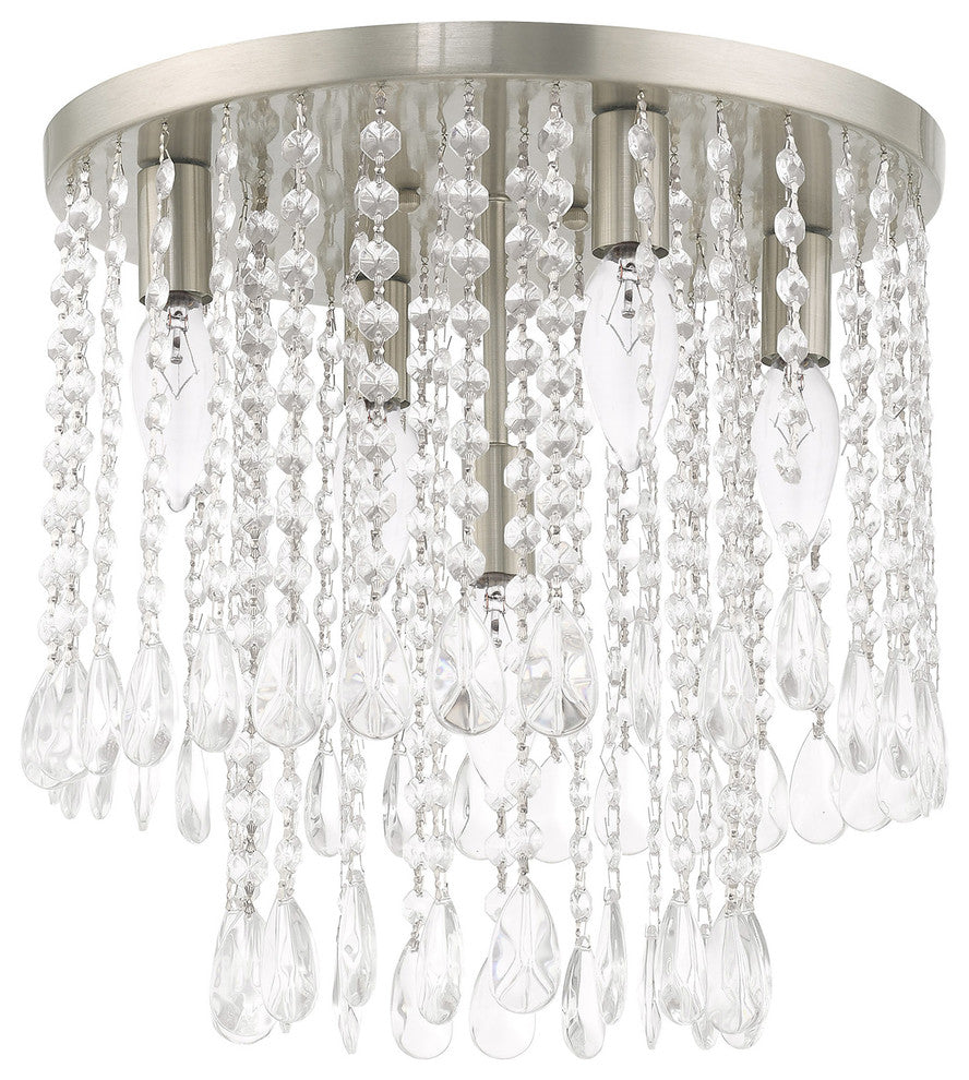The brushed nickel finish decorates the beautiful design of the Elizabeth five light ceiling mount with a refined quality. Clear crystal frills offer detailed elegance to the design of this ceiling light. Attract attention with the bold personality provided by this lovely fixture.