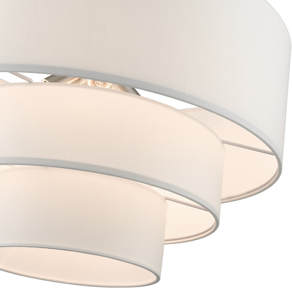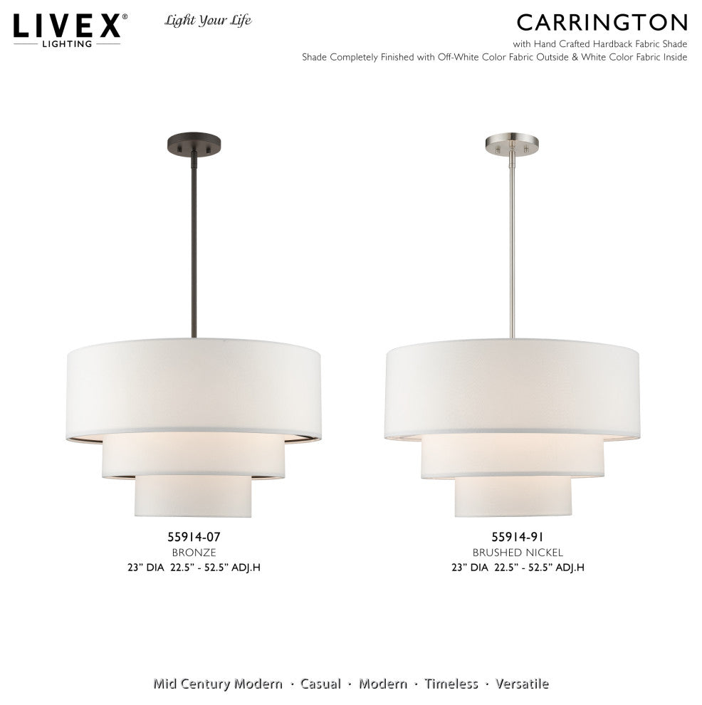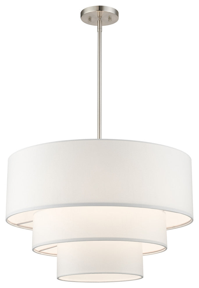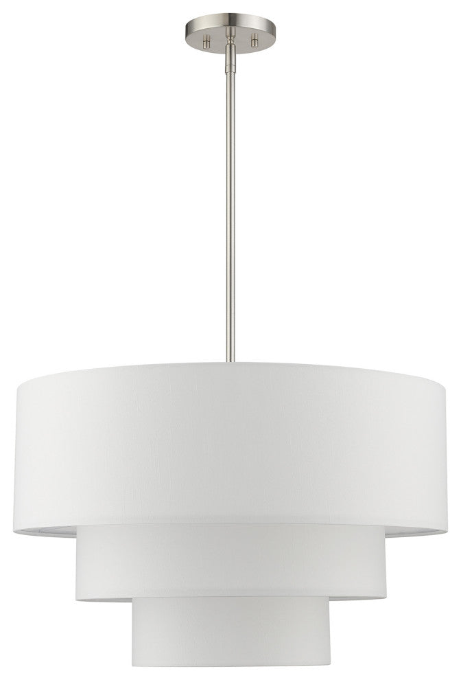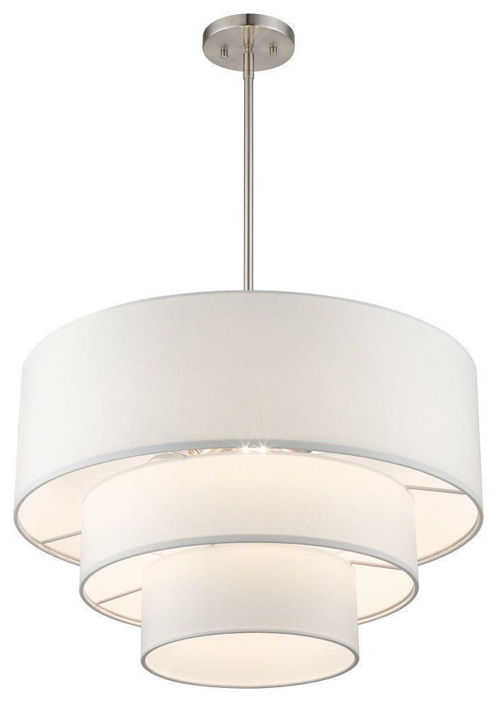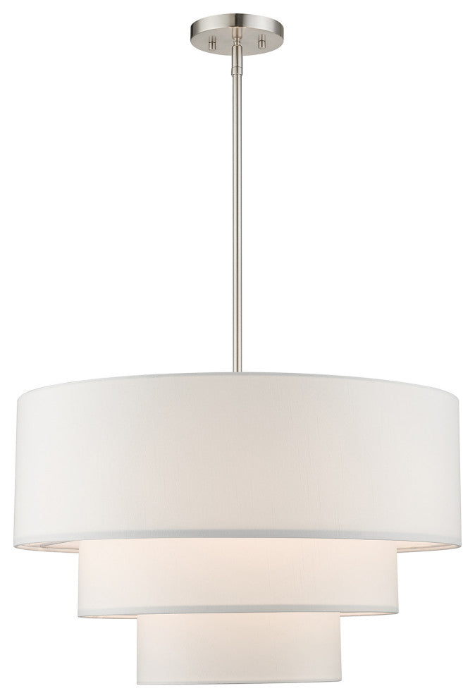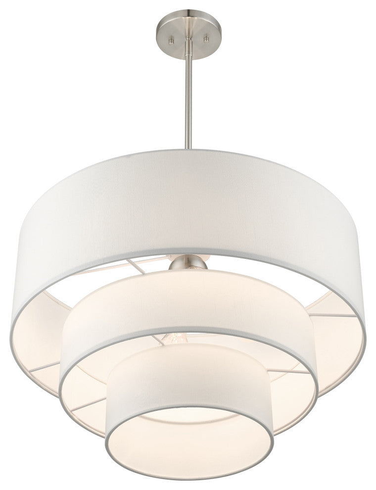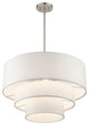 The Carrington pendant chandelier is both modern and versatile. The hand-crafted off-white colored fabric hardback shade is set off by the silky white fabric on the inside setting a pleasant mood. The four-light triple drum shade adds character to this handsomely styled pendant. Perfect fit for the living room, dining room, kitchen and bedroom. This sleek design is shown in a brushed nickel finish.