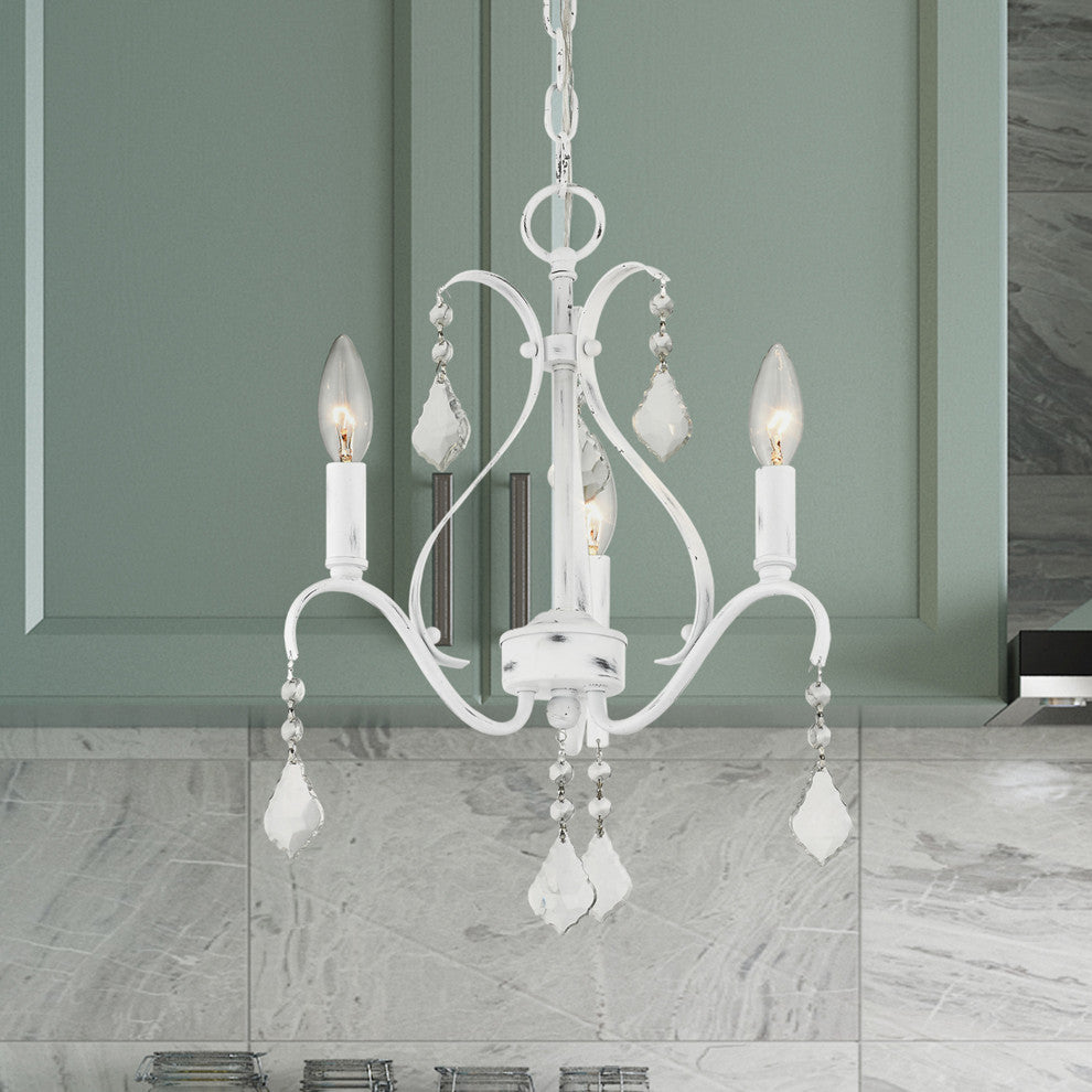 Add some simple elegance to your space with our Caterina three light mini chandelier. Complete with clear crystals and an antique white finish, it''s an essential transitional piece for any room.