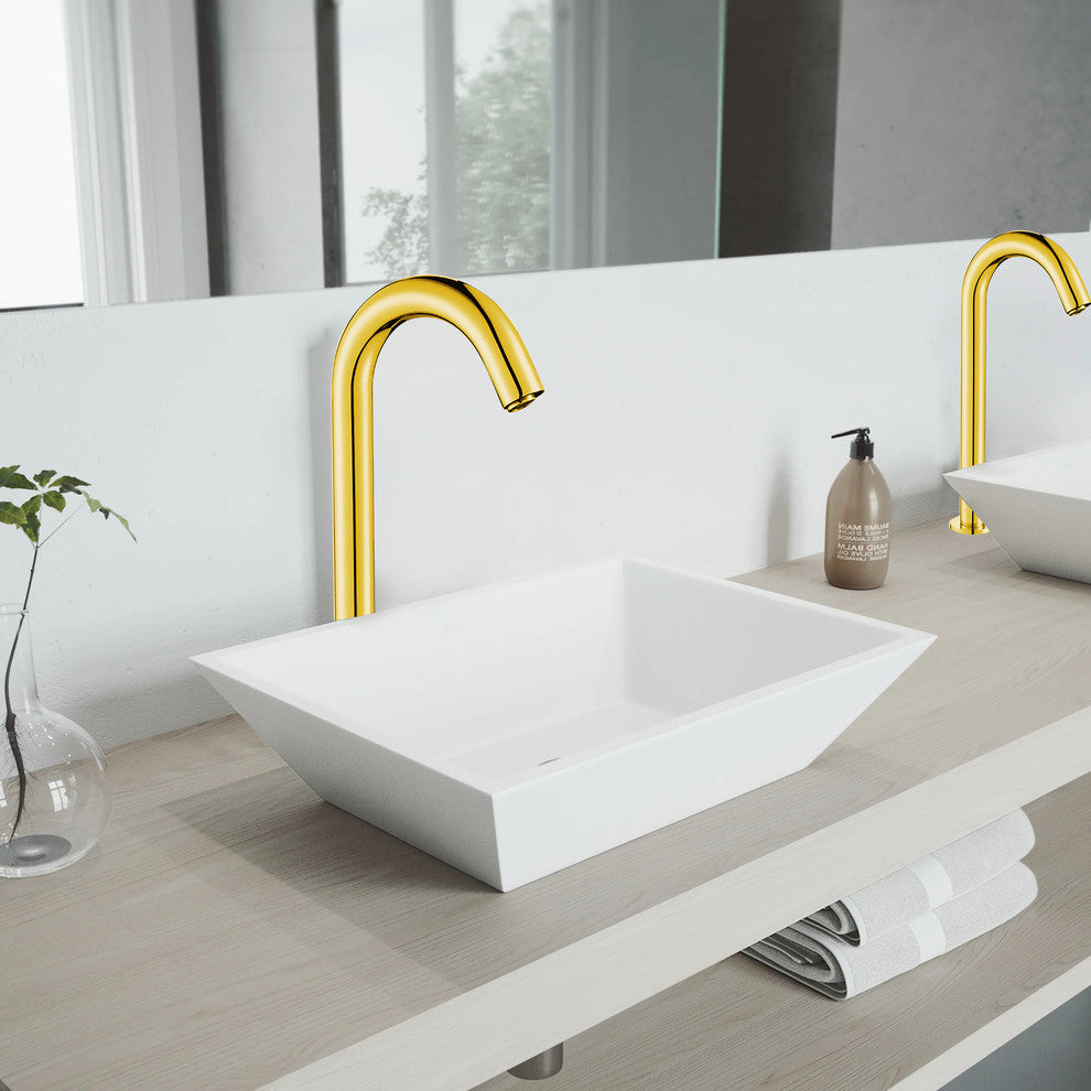 The Livorno Automatic Sensor Faucet is a Stainless Steel Faucet, which comes in Gold Finish. The Livorno Faucet is a Deck-mounted which requires Single Hole for Installation that have a Ceramic Valve Core. Livorno Stainless Steel Automatic Sensor Faucet Specifications: Type : Bathroom Sink Faucet Installation Type : Deck MountedStyle : ContemporarySurface Treatment : PolishedSpool Type : Ceramic Plate SpoolStyle : Quick Open TypeFeature : Automatic Sensor FaucetValve Core Material : CeramicFaucet Mount : Single HoleNumber of Handles : NoneMaterial : 304 Stainless SteelFinishing : GoldSensor Feature : InductivePower : AC/DCDia. of inlet pipe : G 1/2"Flow Rate: Maximum 1.8 GPMAerator Included: Minimum .5 GPM