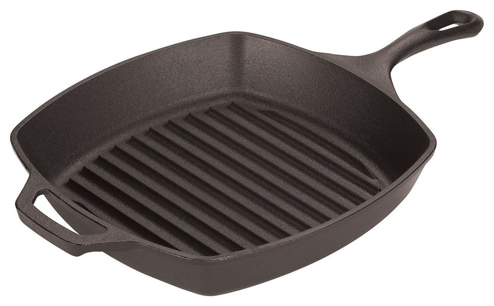 The Lodge Square 10-1/2" Grill Pan is a wonderful addition to any kitchen or campsite. Use this pre-seasoned high-sided square grill pan to sear meat, seafood or vegetables with grilled flavor. The channels drain grease, providing a healthy alternative to nonstick cooking. With the high sides, this grill pan distributes and retains heat to ensure even cooking. Adds the authentic grill marks and toasting to burgers, panini sandwiches, grilled cheese, Reubens and more. This pan will last for generation. Restaurant quality grill marks are pleasing to the eye but the flavors generated by Lodge ribbed bottom pans always generate satisfied smiles and compliments.Highlights:Square: 10-1/2" Depth: 1-3/4" Pre-seasonedComes with assist handleSquare grill pan with ribbed bottomReady to use upon purchaseUse on gas, electric or induction stovetopsProduces beautiful grill marksKeeps foods from simmering inFatty drippingsUse & Care:Hand washDry immediatelyRub with a light coat of vegetable oil after every useYou may experience some sticking with new cookware so use a little oil when cookingMild soapy water is fine, if you dry and oil immediatelyLodge seasoned cast iron is right at home on any heat source, except the microwave