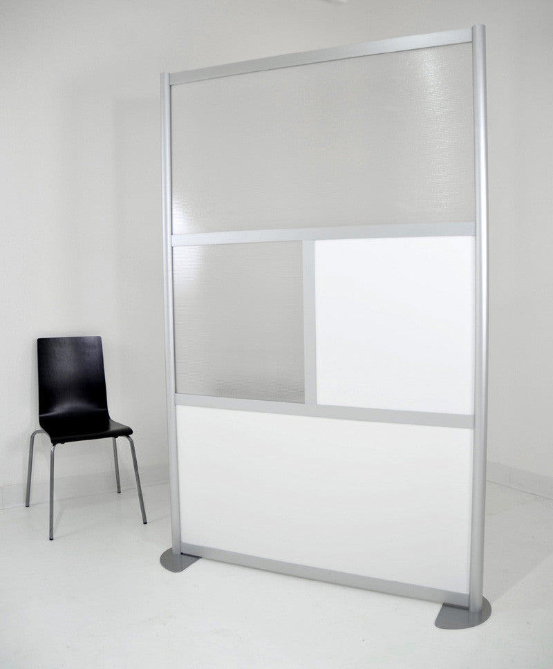 The The LOFTwall LW4 78" High with white and translucent panels is a modern and innovative room divider good for both commercial space and private homes! The aluminum interlocking frame is modular, durable, lightweight, and easy to move around. It is perfect for offices, loft spaces, and private living areas! It is the nice solution when a permanent wall is not feasible or a durable freestanding and movable wall is preferred. The anodized aluminum frame has a mat silver finish. Combine with add-ons, corner connectors, and other sizes to create the room divider solution you need. There are various bases, casters, shelf configurations, and multi-wall connectors available. See the whole collection available.LOFTwall space dividers are made in the USA and ship flat packed and come with easy assembly instructions. It comes with clear guides which makes it quick and easy.Material:Frame: anodized aluminum with interlocking system, made from 75% recycled contentInfill Panels: .25" thickness panels, meet indoor air quality standardsBases: 1/4" powercoated steel (for weight and stability)Dimensions:52" Wide x 78" High, wall is 1.75" thick - thin base is 13"