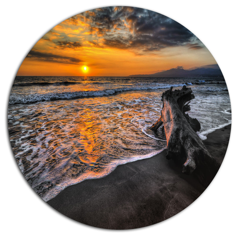 Bring Contemporary Abstraction to your home with this large Circle Metal wall art. This Log on Beach During Sunset Metal Artwork makes it the focal point of any room or office.