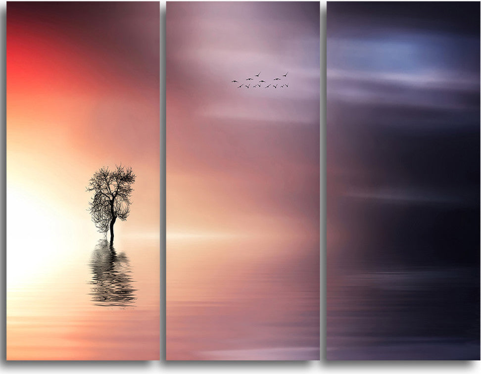 "Lonely Tree and Birds Panorama" Metal Landscape, 3 Panels, 36"x28"