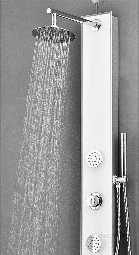 The Loreto Shower Panel System is a Multi-Functional Shower Panel which comes with an Over Head Shower, Massage Shower System & a Hand Held Shower. Loreto Shower Panel System SpecificationsType: Shower Panel SystemShower Panel Height: 43. 3" Shower Panel Width: 6. 3" Shower Panel Depth: 3" Shower Panel Reach: 16" Shower Panel Material: Tempered Glass & Aluminum Shower Arm Length: 13. 78" Shower Arm Material: Brass Shower head Dimension: 6" Diameter Shower head Material: Stainless Steel Hand Shower Dimension: 7" (L) x 1" (D) Hand Shower Material: Brass Hand Shower Hose Length: 59" Hand Shower Hose Material: Stainless Steel Flow Rate: Maximum 1.8 GPMAerator Included: Minimum .5 GPMFaucet Material: Brass Water Line Connection Type: 1/2" FIP 6" stainless steel ultra thin rainfall shower head with 51 nozzles 3 stage shower function (Rainfall, Horizontal Massage Spray, Hand Shower) Single function control. One function at a time. 2 adjustable angle brass massage jets with 18 nozzles on each jet 59" long stainless steel chrome hand shower hose