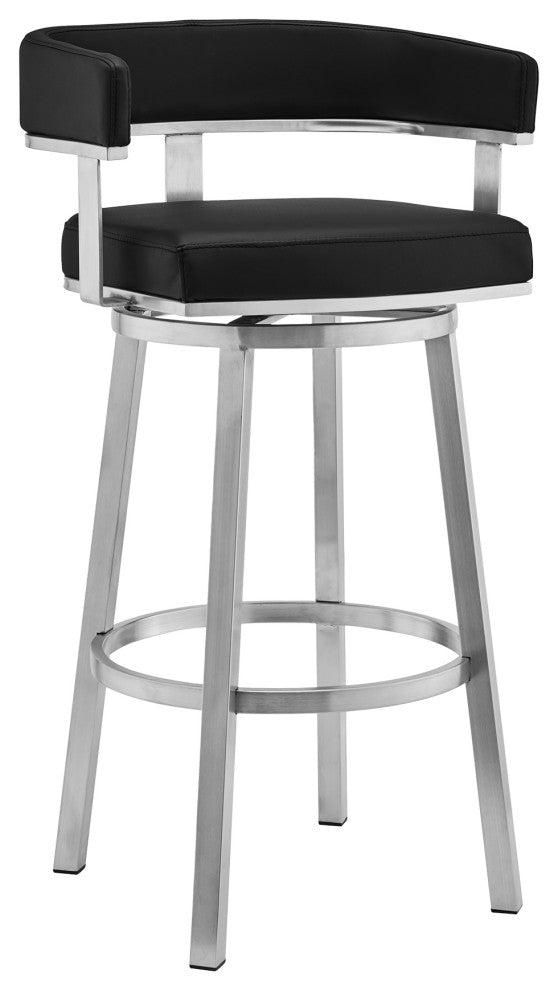 Lorin Black Faux Leather and Brushed Stainless Steel Swivel Bar Stool, 26 Inch