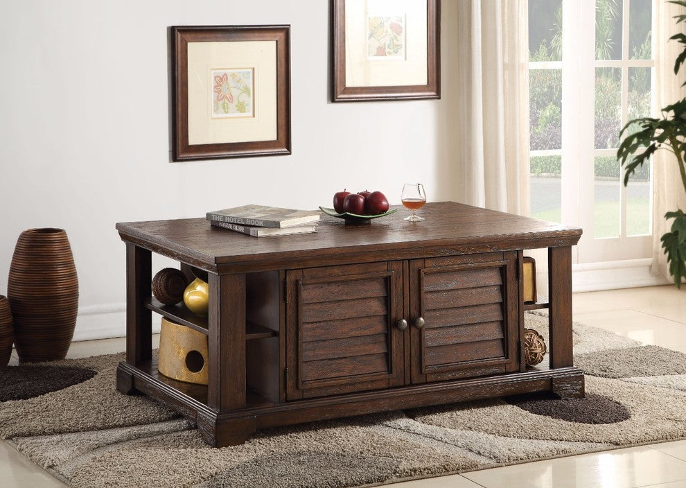 This coffee table create a contemporary feel in your living room or seating area, which blends dark oak finish wood. Simple yet unique styling, this coffee table will become the centerpiece of your living room. This table comes with ample storage, 2+2 Open Compartments (2 Each Side) & Shutter Doors with 1 Shelf Inside (Cabinet)