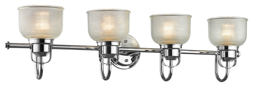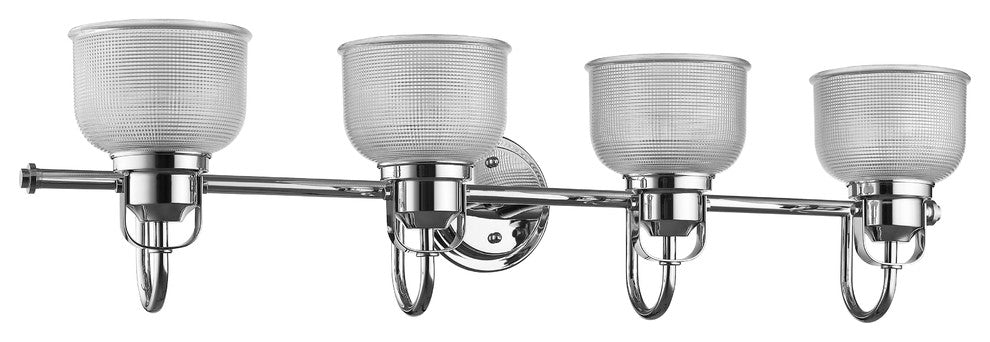 This industrial-style 4-light bath/vanity light features a chrome finish that will complement many urban, loft, or transitional decors. The clear prismatic glass shades soften the light to create a warm ambiance and completes the look of this piece.