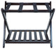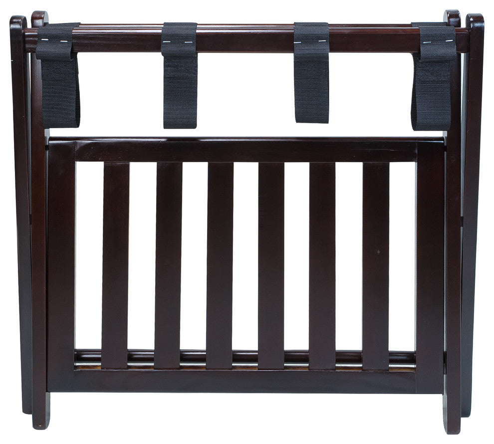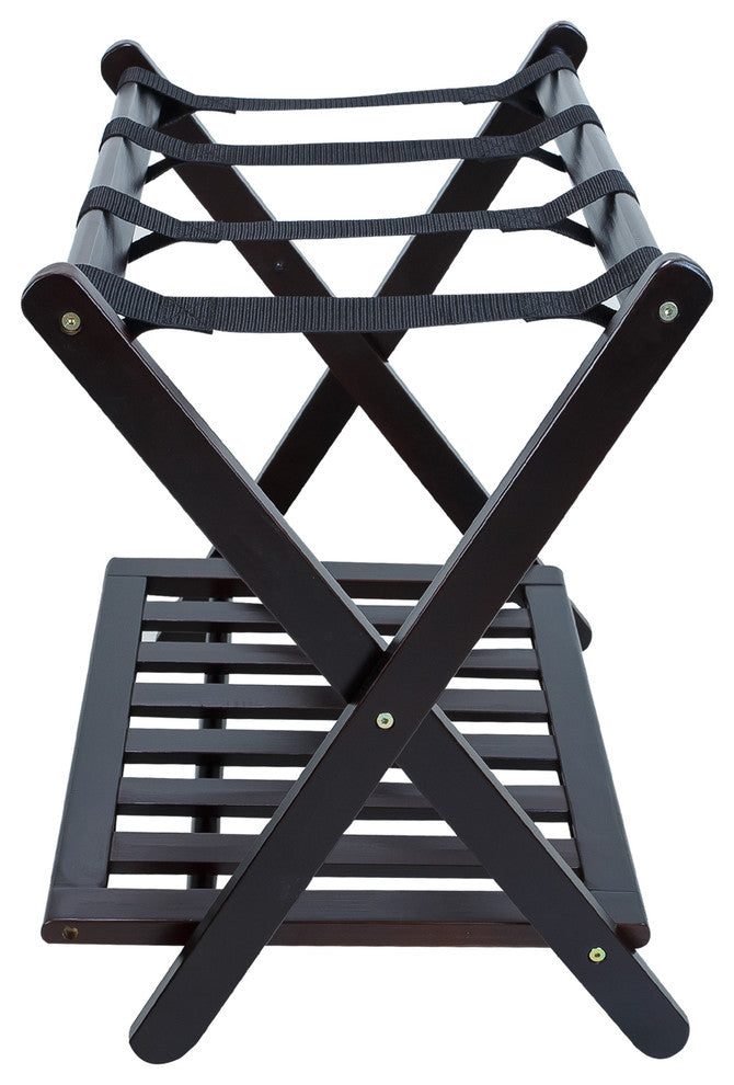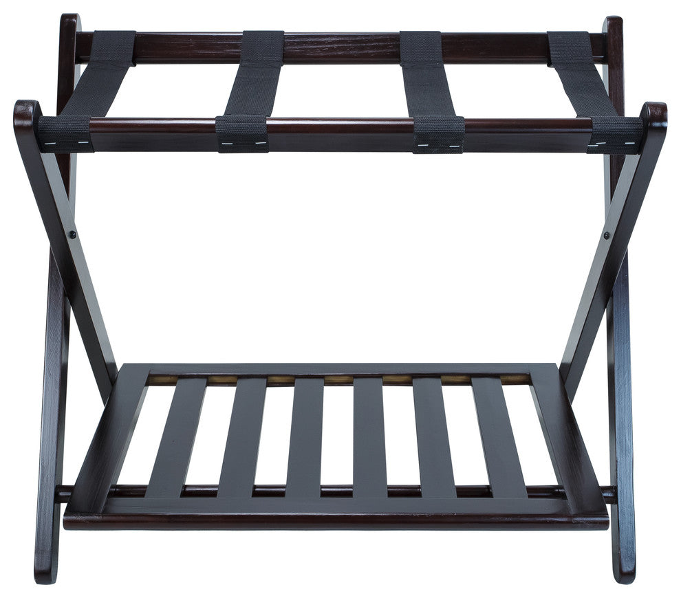 Hotel-style folding luggage rack welcomes guests with a convenient spot to pack and unpack. Our luggage rack constructed with solid wood in warm Walnut finish with black straps. Sturdy construction supports up to 150 pounds on top shelf and 50 pounds for lower shelf. The convient lower shelf provides extra space to store items off the floor. No assembly required.