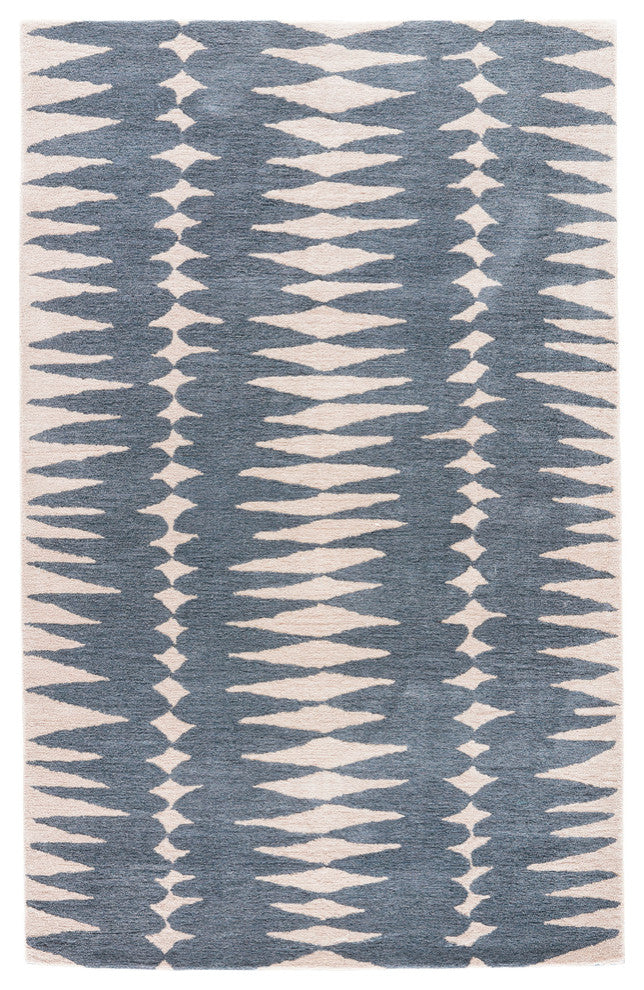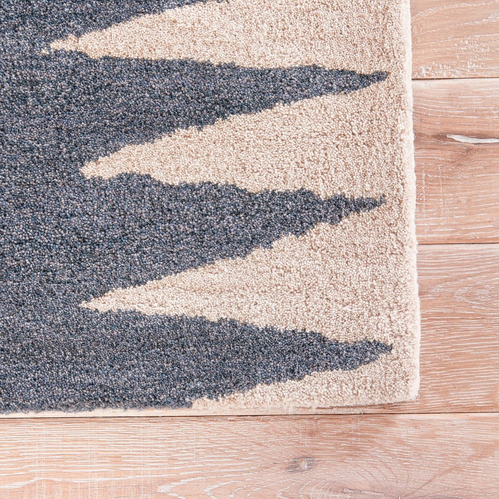 A modern area rug with artistic edge, this hand-tufted accent boasts the plush feel of durable wool. Tones of blue and gray create a captivating tribal effect on the contemporary cream backdrop.