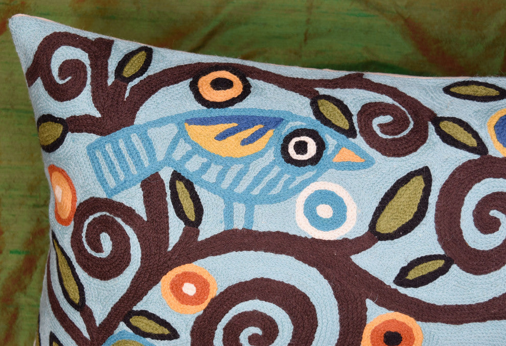 Klimt Tree of Life Birds throw Pillow Cover "“ The Tree of Life branching up to the blue sky with and its roots in the earth. Using elements of Klimt, yet inspired from oriental tree of life design with birds, this piece offers a dramatic accent to any room. The entire cotton base of the pillow is overlaid with soft wool, stitch by stitch, creating an extraordinary show piece for your decor. This is world-class workmanship created to enhance your world with dynamic color and motif.Composition: 70% Wool, 30% CottonSize: 14"³ x 20"³ (35cm x 51cm)Backing: Canvas ( See Last Picture )Pillow Insert not Included (Only Cover is on Sale)Hand embroidered in Village Cottage UnitsThese modern pillow covers are handcrafted by Kashmiri artisans, and are of the finest chain-stitch embroidery in the world.Created of soft Kashmir wool over cotton, this all-natural cover makes an enduring impression.A close-up view of this abstract pillow cover allows you to see the amazing chain-stitch embroidery work of master artisans who have practiced this art their entire lives.This abstract decorative pillow cover could grace the cabin of your boat or the chair in your solarium and yet be equally as comfortable in your den.The eye-popping color and pattern of this modern throw pillow is just what the designer ordered to create a fiery focal point in your décor. Perfect wherever you need a splash of color, this art work pillow creation is as durable as it is beautiful. Easy to care for, this cushion cover could spark up an old throw pillow or grace a new pillow form.Gustav Klimt is remembered as one of the greatest decorative painters of the twentieth century, and also produced one of the century"™s most significant bodies of erotic art. Initially successful as a conventional academic painter, his encounter with more modern trends in European art encouraged him to develop his own eclectic and often unique style.Klimt believed in the equality of fine and decorative art, and was one of the most influential exponents of Art Nouveau, the movement that spread throughout Europe in the late 19th century.