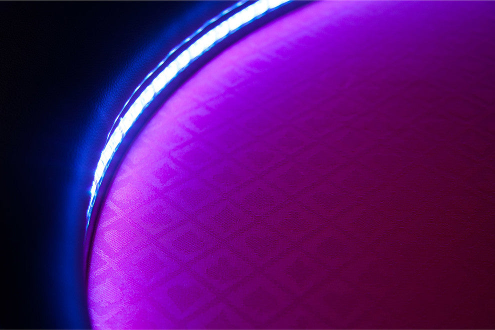 Imagine the ability to change the feel and mood of your game instantly, this is what the Lumen HD Poker Table brings to your game. A spacious, ten player plus dealer poker table accented by its signature, remote controlled waterproof LED trim. Solid oak Napa pedestal legs gives the Lumen HD a strong stance with a clean look which does not overpower the beauty of the red suited speed cloth playing surface. The generous configured with stainless steel cupholders in the durable black vinyl armrest offer a comfortable place to spend hours playing. The Lumen HD Poker Table dimension are 101.5?L x 46?W x 30?H and features 16 changeable LED lights, 5 light modes and a remote to control it all. Some assembly required.