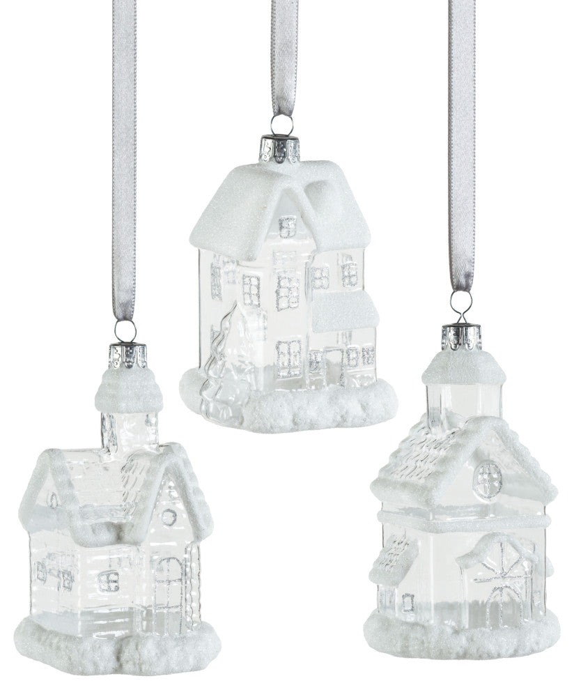 A striking glass ornament set that will bring a modern edge to your Christmas decor. This glass house set creates a warm and inviting look and pairs perfectly with any existing holiday ornaments. Adorn your home decor and holiday decor with these attractive Christmas ornaments.Set of 6 hanging ornaments''traditional clear glass baubles in snowy houses with glitterProduct dims: A-2.36" x 2.76" x 4.33", B-2.56" x 2.36" x 3.74", C-2.76" x 2.36" x 4.33"Equipped with silver ornament capEach comes with a string to make it easier to hangPerfect addition to your holiday tree decor