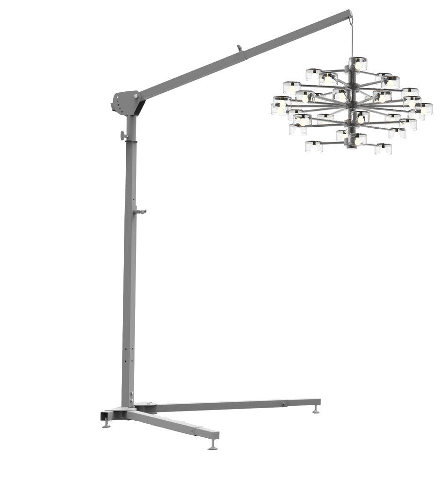 Our Los Angeles factory designed and built this one of a kind solution for hanging a chandelier or pendant light in any room. It''s slim, minimalist appearance makes it appropriate as a permanent fixture in a modern home, or it can be fully collapsed and transported, perfect for event production companies. We use 14 gauge American-sourced steel, American labor and inspect every unit before it leaves the factory. FEATURES:5 tilt anglesEight height positions up to 12 feetPole arm length 3-6 feetBase legs extend 3-6 feet360 degree rotationAdjustable premium quality glidersSimple, reliable pull-pin technologyFully collapsableQuick setup and breakdownLooks great as a permanent fixtureWhat''s Included:Main postTelescopic legsTelescopic arm boomBasex4 glider feetx3 adjustment handlesx2 pop-pin locksx6 38" locktight nutsx5 2" bolts, 3/8" threadUtility hook boltPre-stripped power cordPair of wire splicing lugsInstructions