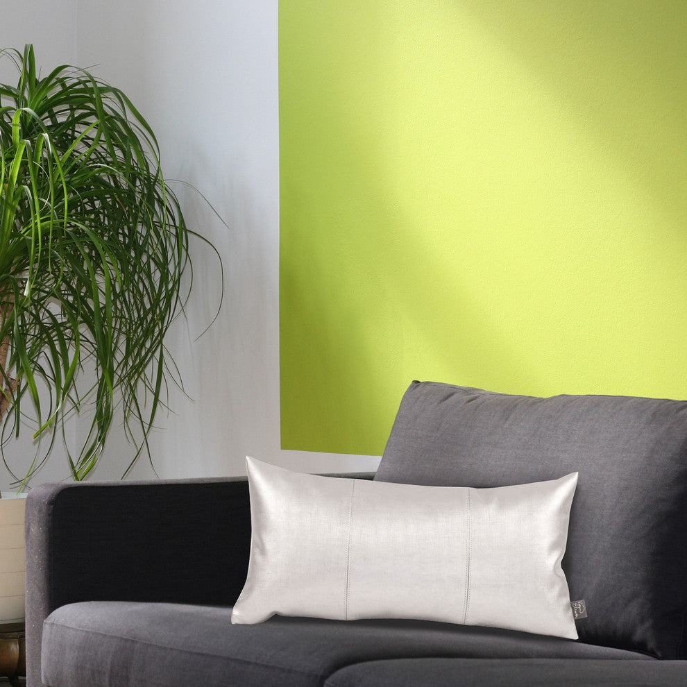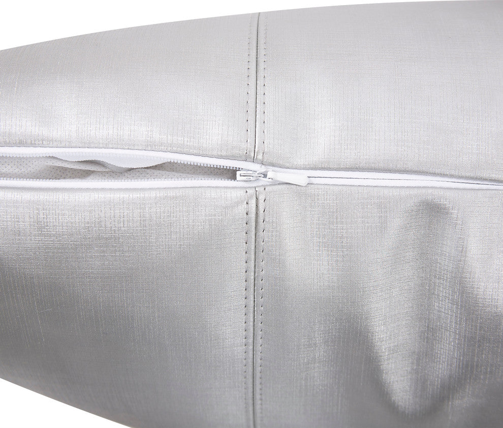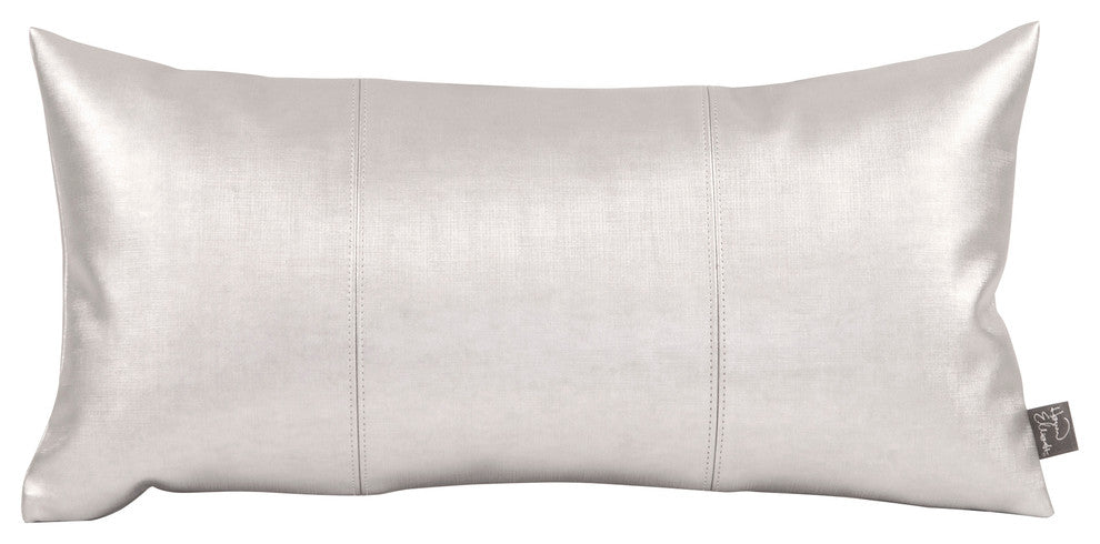 Change up color themes or add pop to a simple sofa or bedding display by piling up the pillows in a multitude of colors, textures and patterns. This Shimmer Pillow features a metallic mercury silver color, textured leather-like grain and a paneled design to give the look of true leather. Includes lush polyester pillow fill insert.