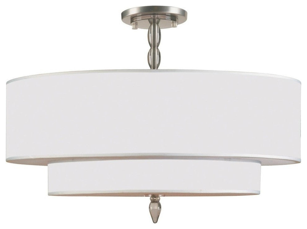 Antique brass center stems support large dramatic shades bringing understated luxury to any room with the Luxo collection. The ceiling mount features a white silk shade with satin nickel accents . With the option to convert between a chandelier or ceiling mount the versatility allows for accommodation of a variety of spaces. While sleek and streamlined this transitionally designed fixture is still a statement.