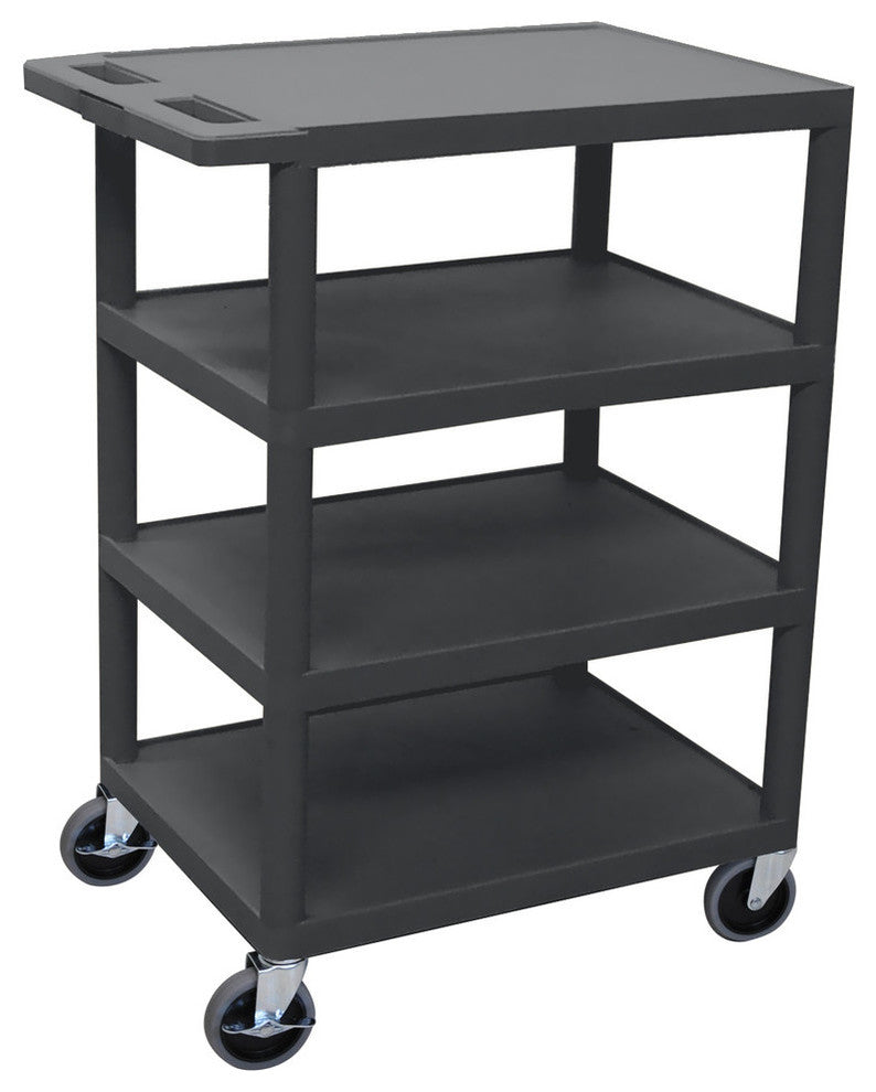 For your stowing and hauling needs, this handy utility cart offers four flat shelves spaced 8.5" apart, made from tough thermoplastic resin that''s scratch and stain resistant. Each shelf also features a .25" retaining lip to keep contents from sliding off. Heavy-duty 4" casters and an ergonomic push handle make it easy to maneuver even when fully loaded, up to 300 lbs. It''s perfect for any restaurant, facility or business looking for a systematic solution to serving, storing or transporting items.
