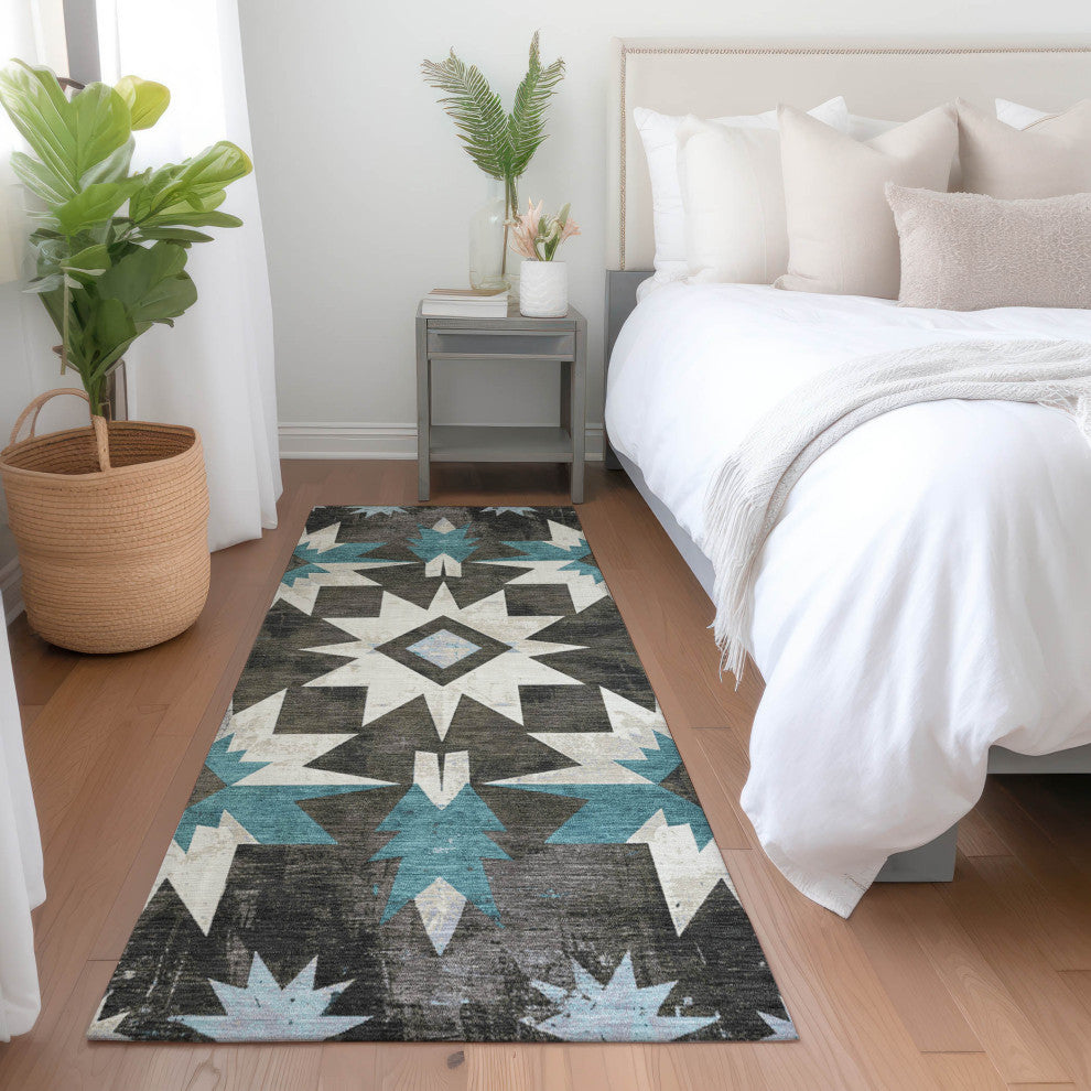 Immerse yourself in the stunning design of this transitional-style rug, featuring Aztec-inspired star motifs and geometric accents. Designed for flexible indoor and outdoor use, this UV-stabilized rug showcases an ultra-thin, flat-woven texture with a non-skid backing that eliminates the need for an extra rug pad. Its machine washable nature makes it a practical choice, accommodating the dynamic needs of families with pets.