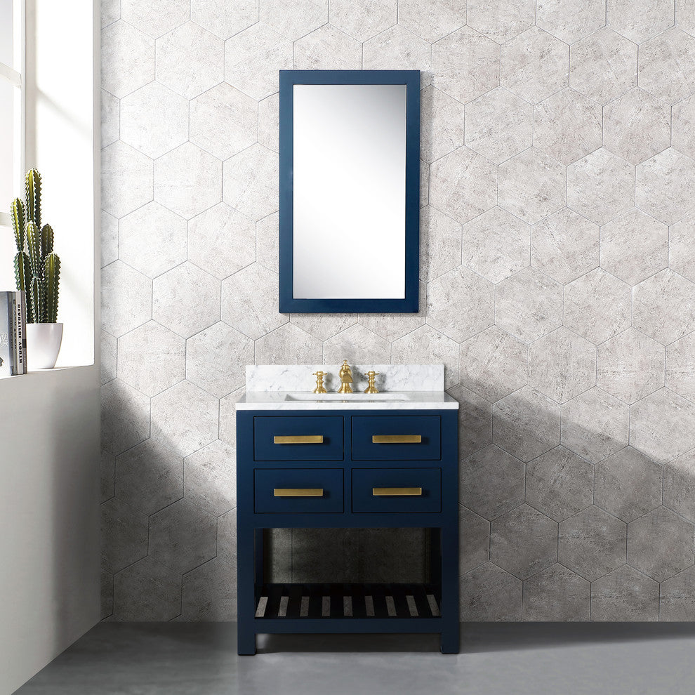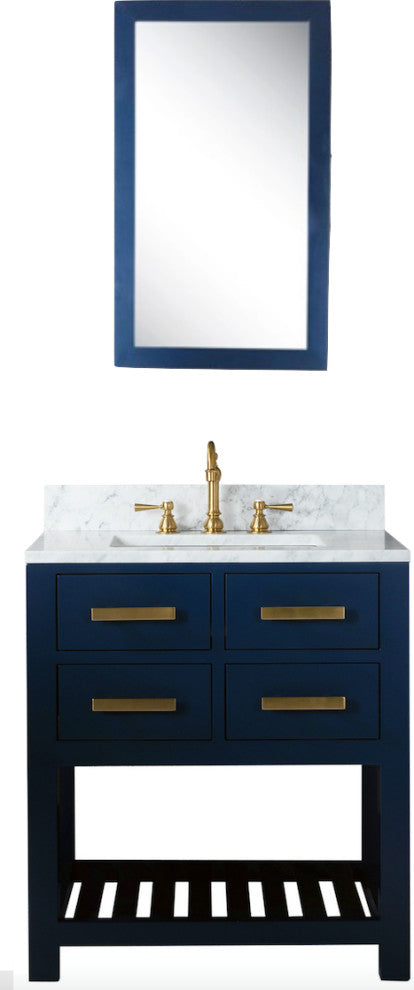 Water Creation''s collection of premier single sink bathroom vanity and mirror combos will add a level of sophistication and class to any bathroom''s decor. The crossroads of timeless design and innovative modern manufacturing processes merge harmoniously to ensure each vanity''s finishes and function are as reliable as their unmistakable beauty. Constructed of 100% hardwood and not particle board, Water Creation prides itself on creating high-class Vanity that are designed to last a lifetime. The marble countertop, ceramic sink, and elegantly crafted doors all lend credence to the durability and superior craftsmanship that Water Creation is known for. With the understanding that no one space is alike, all of Water Creation''s vanity designs come in multiple lengths to accommodate any room size.Material: All of Water Creation''s Vanity are made from select hardwoods that have been kiln dried to ensure a stable product that will not expand, contract, or warp.Construction: Using joinery techniques that are made to hold together for a lifetime, all Vanity come fully assembled and include interior shelving and a large cut out in the back for plumbing access.Countertop: All of Water Creation''s Vanity come with solid natural stone countertops that have been sealed at the factory to prevent staining and watermarks. Countertops are pre-drilled for a standard 8" widespread 3 hole lavatory faucet. The backsplash is included. It is optional to attach the backsplash onto the vanity top.Sink: Undermount rectangular shaped ceramic sink included.Finish: The multi-step finish process on the Vanity is not only rich with color and pleasing to the eye, it is also a very durable; acting as an outer shell to help protect your vanity from wear and damage that may occur in everyday use. Actual color may vary slightly due to different computer monitor display settings.For the MADALYN bathroom vanity collection, a matching wall cabinet is available under SKU: MADISON-TT-MB.For the MADALYN bathroom vanity collection, a matching free standing linen cabinet is available under SKU: MADISON-LC-MB.