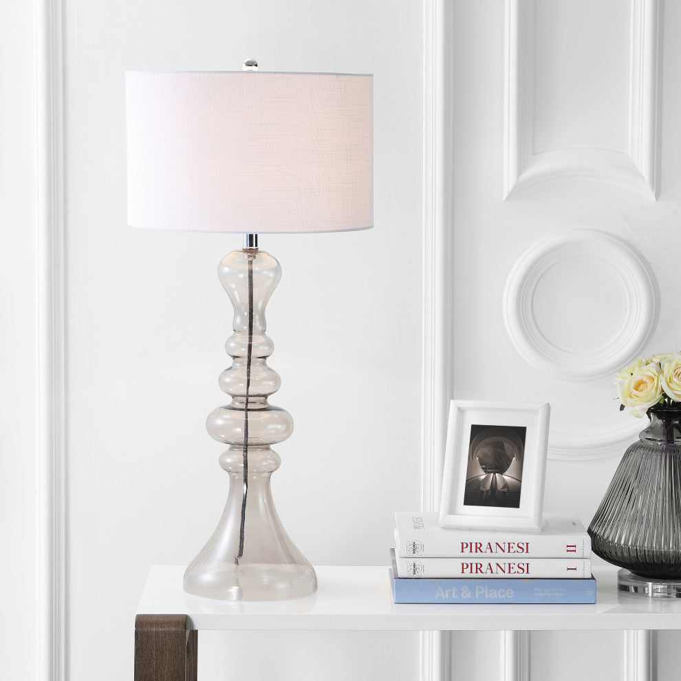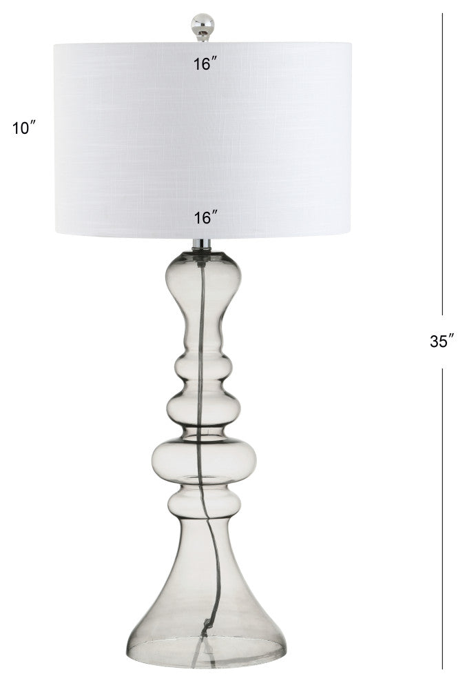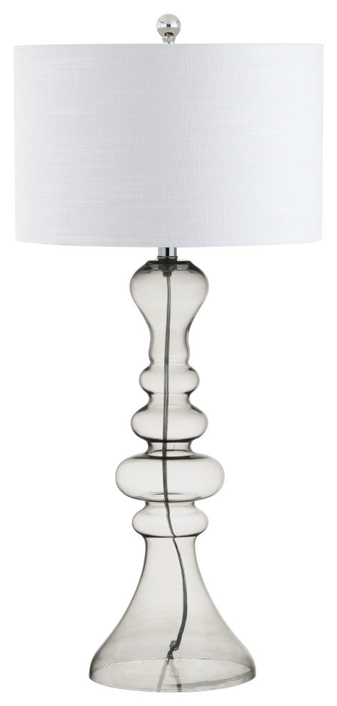 Exemplifying one of the hottest trends in home d''cor, the irregular curvature of this extra tall table lamp brings style to any setting. Finished with a matching finial and white linen drum shade, this piece would be equally at home in a foyer or at your bedside. Classic touches like a silk-wrapped cord and modern conveniences like LED compatibility make it as practical as it is beautiful.-Curved glass pillar base in gray glass-100% cotton hardback drum shade in white-Beautiful to display or easy to conceal: the 60" cord is silk-wrapped-On-off rotary switch on socket-Takes one bulb and compatible with any type "A" 100 watt incandescent, 23 watt CFL, or 12 watt LED -Eco-friendly 9W LED bulb included-Sleep easy knowing that all components of this piece are UL Listed, safe for your home''s electrical grid -Color: Smoke Gray with white shade-Body Material: Glass-Base Material: --Finial Material: Plastic-Finial Color: Chrome-Harp Color: Silver-Includes: One (1) lamp(s)-Minor Assembly Required-Lamp: 35 inches high x 16 inches wide x 16 inches deep-Shade: 10 inches high x 16 inches wide x 16 inches deepAbout us: You see a lamp.We see a decorative work of art.A perfectly curved shade casts a dramatic shadow on a floor. A silk cord you never want to hide. LED lightbulbs: as easy on the environment as they are on the eyes. The JONATHAN Y Lighting collection considers every detail from impeccably sourced materials to designer styling. And our prices are so attractive, we''ve transformed a functional necessity into a fashion accessory.JONATHAN Y Lighting - a fashion revolution in home decor.