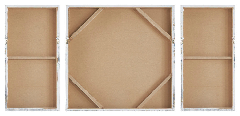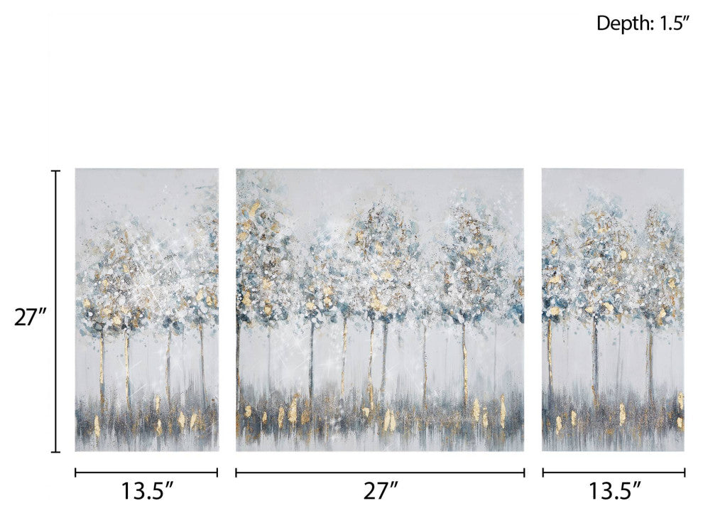 The Madison Park Blue Midst Forest Gold Foil Triptych 3-piece Canvas Wall Art Set offers an enchanting update to your home decor. These printed canvases feature an abstract, watercolor landscape in cool blue and grey hues with gold foil detailing that adds an eye-catching accent to the design. 2 D-rings on the reverse of each wall art makes them easy to hang together or separately. Comes as a three piece set with one panel measuring 27x27" and the other two measuring 13.5x27", this canvas set is the perfect focal piece to hang in your living room, bedroom, or home office.Size :1 Center Piece:27"W x 27"H x 1.5"D2 Side Pieces:13.5"W x 27"H x 1.5"D (2)Material:MDF: 40%Paper: 20%Canvas: 20%Gel: 10%Foil: 10%Features:27"W x 27"H, 13.5"W x 27"H (2) Set of 3Triptych canvas wall decor set with blue and grey abstract forest art Each piece is hand finished with gold and glitter embellishments D-ring hangers to hang vertically Indoor use only. Spot clean only