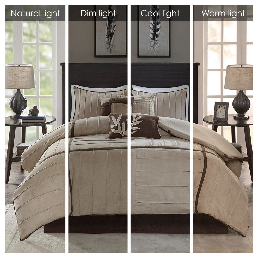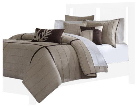 Dune is a perfect bed for any room in your home. Made from the highest quality micro-suede, this bed has a super soft feel. The pintuck details and accents of chocolate brown strapping set off the neutral colors in the perfect way. 2 Standard Shams: 20x26+2"(2)1 Comforter: 82x90"3 Decorative Pillows: 18x18"/16x16"/12x20"1 Bed Skirt: 54x75+15" Machine Wash Cold, gentle cycle, and separately. Do not bleach. Tumble Dry Low, remove promptly, do not iron. If there is no free movement in the washer or dryer, use large capacity commercial washer/dryer.Materials: Comforter/Sham: 100% polyester faux suede, pieced, 100% polyester reverse, 8oz/yd2 polyester fillingBed skirt: 100% polyester faux suede, polyester platform