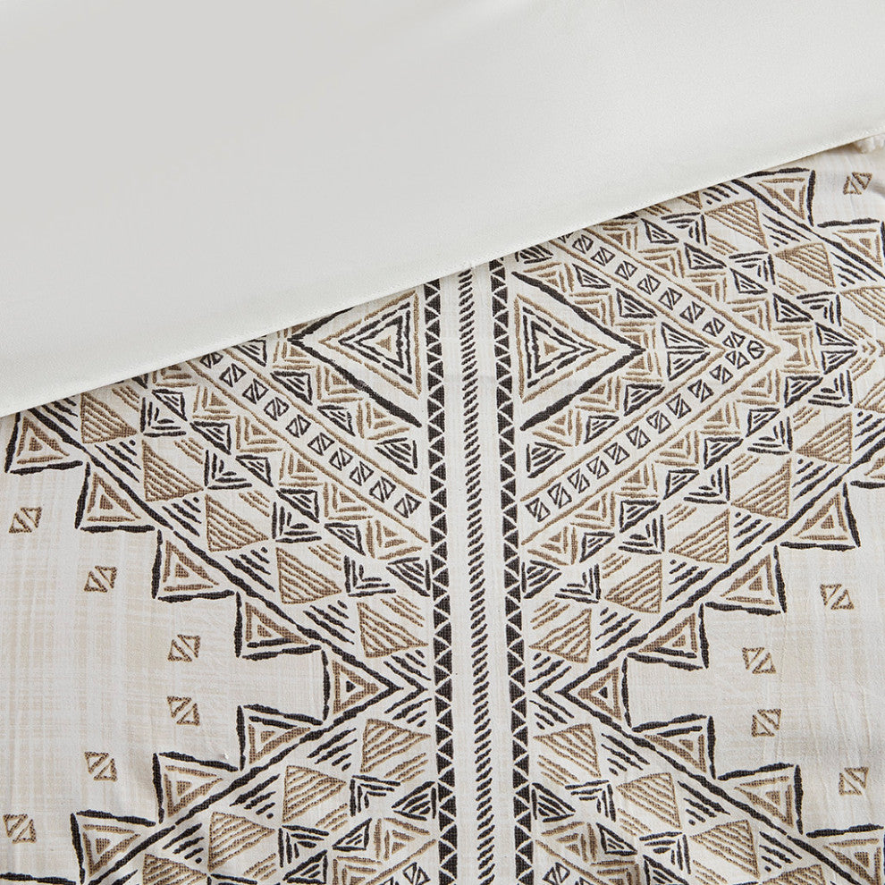 This soft microfiber artisan comforter set displays a printed global inspired design, perfect for chic boho bedroom. Featuring small triangular shapes and lines that when formed together depicts larger geometric shapes and stripes on top of a beige and ivory background. Two white chenille trim at the center of the bed adds dimension to the set while the dark throw pillow adds contrasts. Colors featured in this set include various shade black, brown, tan, and grey. The comforter and pillows are filled with hypoallergenic polyester filling that is treated to be dustproof, ensuring a restful and comfortable sleeping experience. This bedding set is also OEKO-TEX certified and machine washable for easy care.FEATURESSet includes comforter, 2 matching shams, 1 square throw pillowPrinted microfiber; 100% polyester fillingGlobal inspired design featuring black/brown triangular shapes and lines on top of a beige and ivory backgroundTwo vertical puffy chenille trim accent the top of bed for nice detailsMachine washable and spot clean fabric (See care label)Items may come in compressed packaging to ensure efficient shippingItems will need to be fluffed up and steam ironed if compressedHypoallergenic polyester filling in the comforter and pillow (filling contains no allergens and is treated to be dustproof)OEKO-TEX labeled textile certified as safe on skinMATERIALSComforter/Sham: 100% polyester printed soft microfiber, chenille trim face, solid microfiber reverseFill: 100% polyesterPillow: Microfiber cover with polyester fillSIZE 1 Comforter:104"W x 92"L2 King Shams:20"W x 36"L (2)1 Throw Pillow:12"W x 18"L