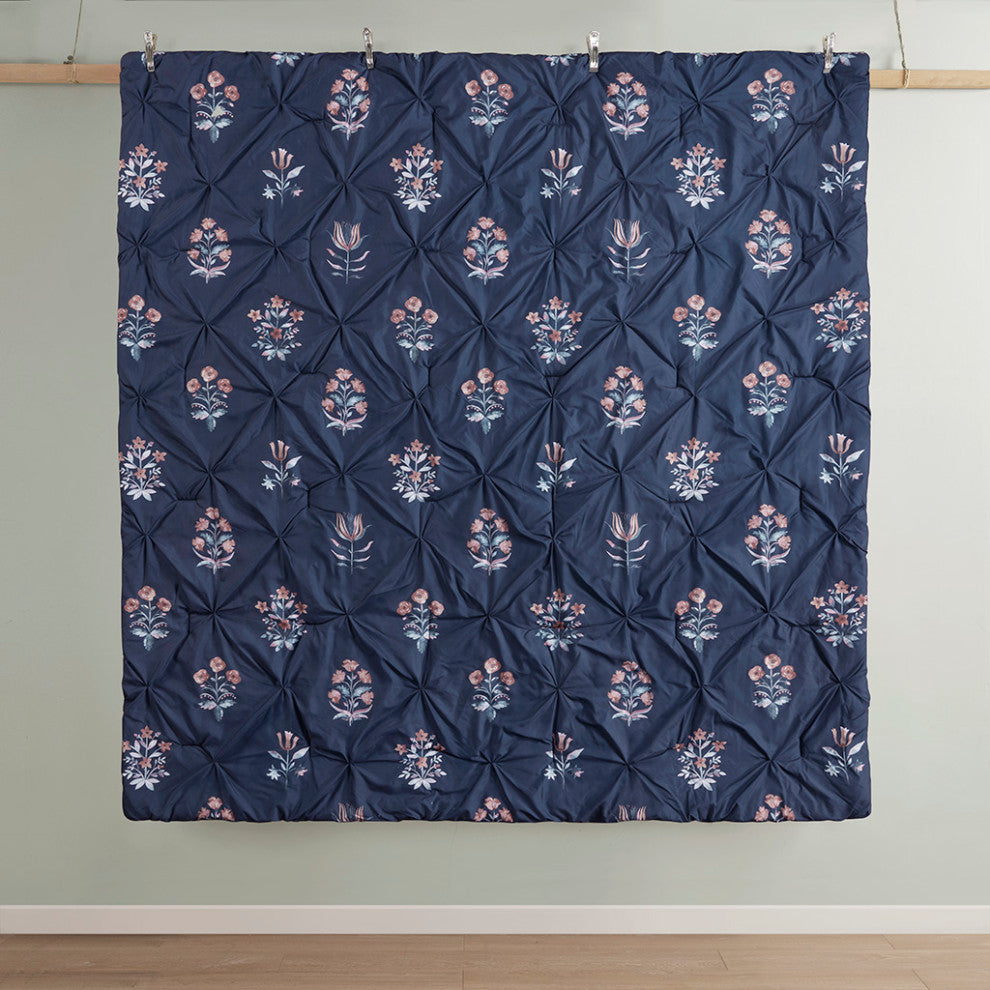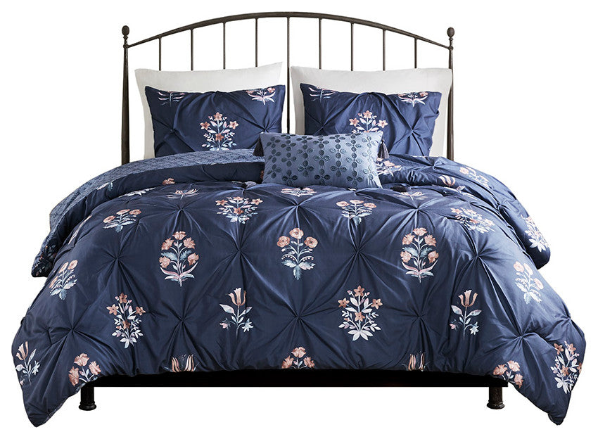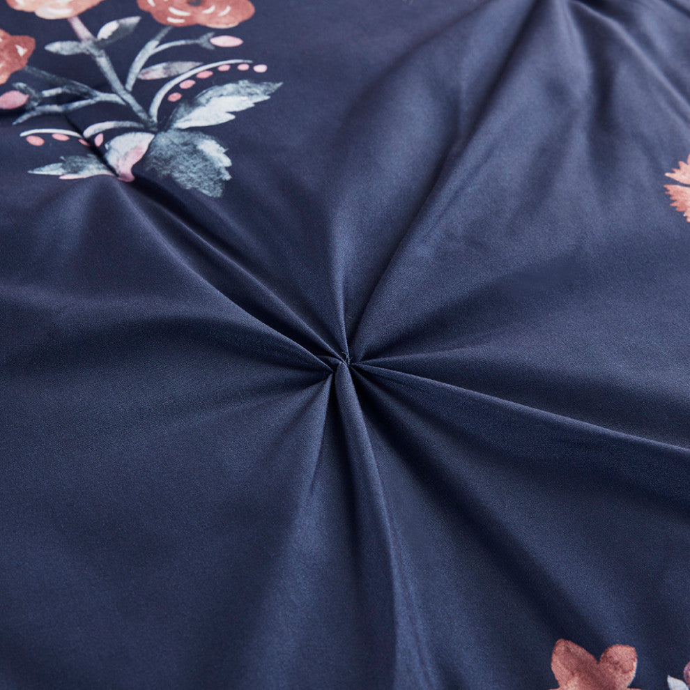 Featuring a floral print on a navy ground with pintuck technique, this microfiber comforter set exudes a modern farmhouse style that adds a touch of elegence to any bedroom. The decorative throw pillow feature gorgeous embroidery and corner tassels that complements the bedding, adding to the overall charm of the set. Colors featured in the floral motifs include shades of peach, blush, red, teal, and white. The comforter and pillows are filled with hypoallergenic polyester filling that is treated to be dustproof, ensuring a restful and comfortable sleeping experience.FEATURESSet includes comforter, 2 matching shams, and 1 decorative throw pillowPrinted Microfiber; 100% polyester fillingModern Farmhouse style featuring all over pintuck technique and floral motif in shades of peach, blush, red, teal, and whiteThrow pillow features embroidery and tasselsMachine washable and spot clean fabric (See care label)Throw pillow may come in compressed packagingThrow pillow will need to be fluffed up if compressedHypoallergenic polyester filling in the comforter and pillow (filling contains no allergens and is treated to be dustproof)MATERIALSComforter/Sham: 100% polyester microfiber printedFill: 100% polyesterPillows: 100% polyesterSIZE 1 Comforter:90"W x 90"L2 Standard Shams:20"W x 26"L (2)1 Throw Pillow:12"W x 18"L