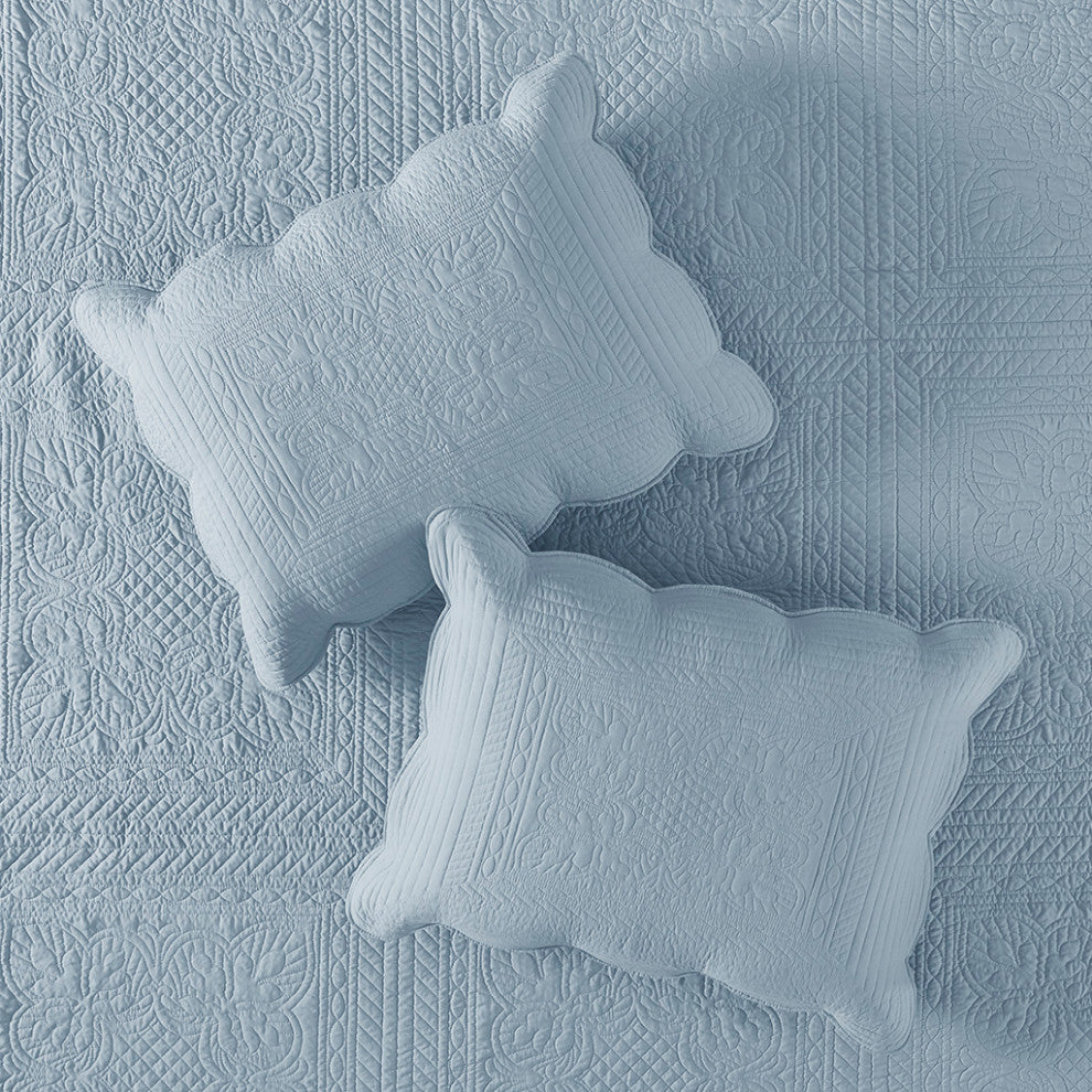 DESCRIPTIONThe Madison Park Tuscany 3 Piece Reversible Scalloped Edge Quilt Set is perfect as a layering piece or as an alternative to your comforter for a charming country look. The quilt and shams flaunt a classic stitch pattern with scalloped edges that add an elegant touch to your bedroom. This reversible quilt is filled with cotton filling and features a soft microfiber face, giving your bed a cozy cottage look. This farmhouse-inspired quilt also has an antimicrobial treatment that provides built-in freshness protection, reducing the growth of odor causing bacteria to keep fabric lasting longer.FEATURES? Set includes 1 quilt and 2 matching shams? Prewash Finish; Soft brushed microfiber face and back, 90% cotton, 10% other fibers fill? Cottage/country style reversible quilt set featuring an intricate patterned stitching with scalloped edges? Lightweight and easy to coordinate - perfect by itself for summer usage or for layering in the winter? Machine washable for easy care? Hypoallergenic polyester filling contains no allergens and is dust proof? Antimicrobial treatment to keep the bedding fresher for longer by inhibiting bacteria growthMATERIALSQuilt/Sham: Soft brushed microfiber face and backFilling: 90% cotton, 10% other fibers fillingSIZE DESCRIPTION1 Quilt:94"W x 96"L2 Standard Shams:20"W x 26"L (2)