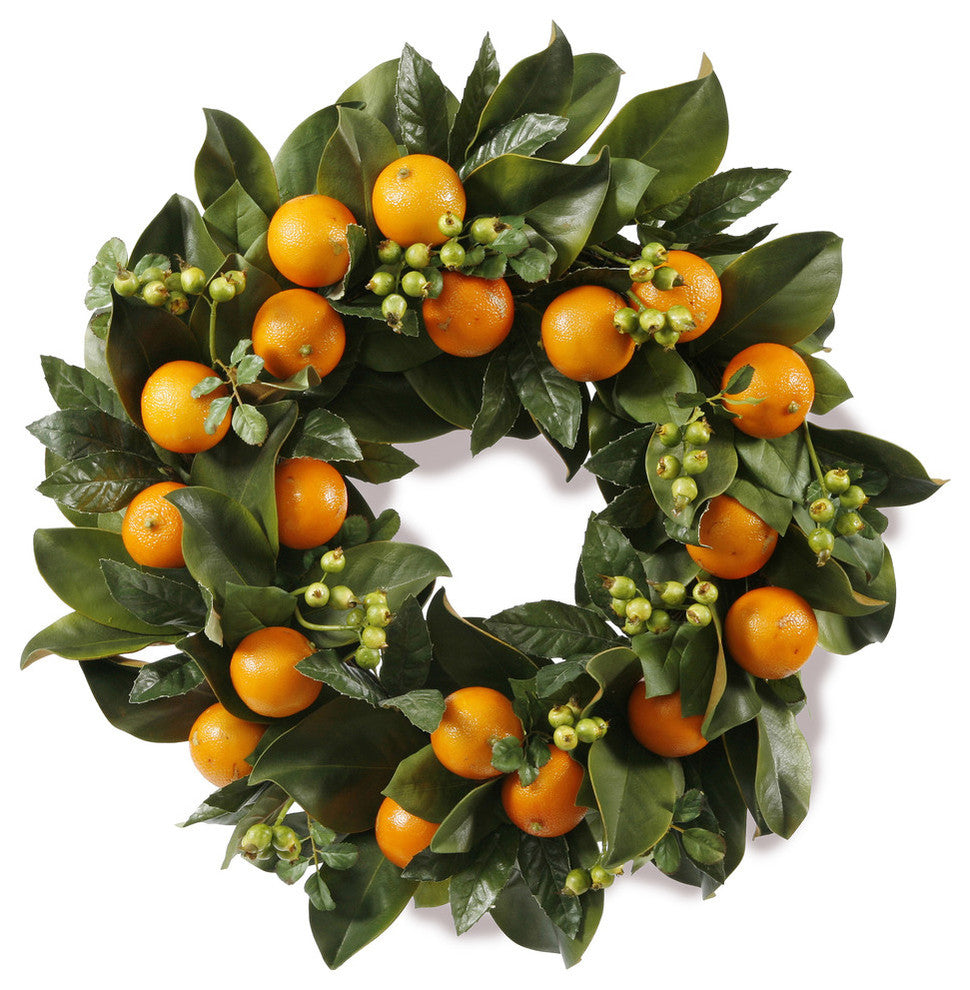 This 24 inch diameter wreath features faux oranges and rose hip berries clustered throughout a bed of extremely realistic faux magnolia leaves. It''s a very organic, natural look that will fit nicely into pretty much any type of home decor environment.