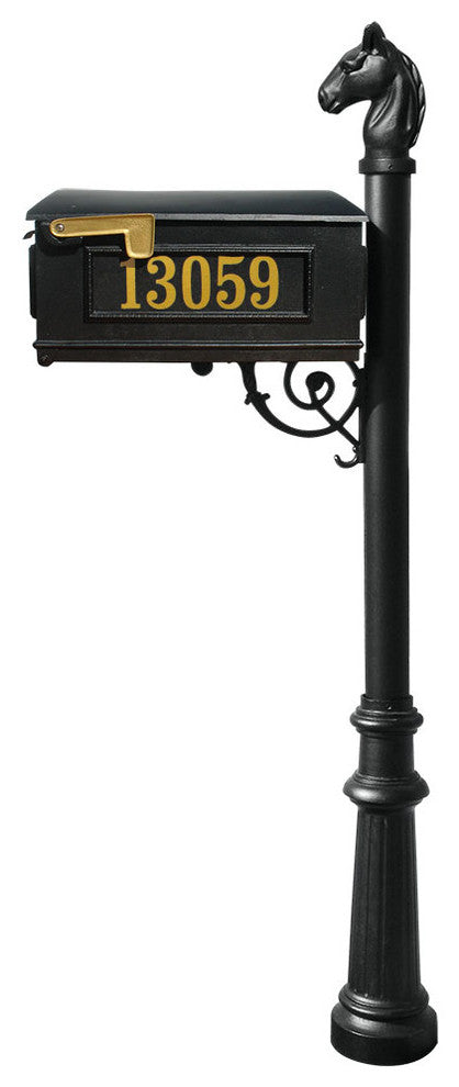 Lewiston Equine Mailbox Post System with decorative fluted base, horsehead finial and Gold Vinyl personalized numbers, BlackOur Lewiston Equine Mailbox Collection is made from rust-free cast aluminum with a durable weather resistant finish. Mailbox comes with post, support brace, decorative horsehead finial and fluted base. Mailbox color is black and features either Gold or White vinyl numbers that are attached to all three sides of mailbox. Post, support brace, finial and base color: BlackMade of cast aluminum with vinyl numbersTough powder-coat finishMailbox has cast gold masonry flagProduct Dimension: 8"x20"x5''2"Color: Black