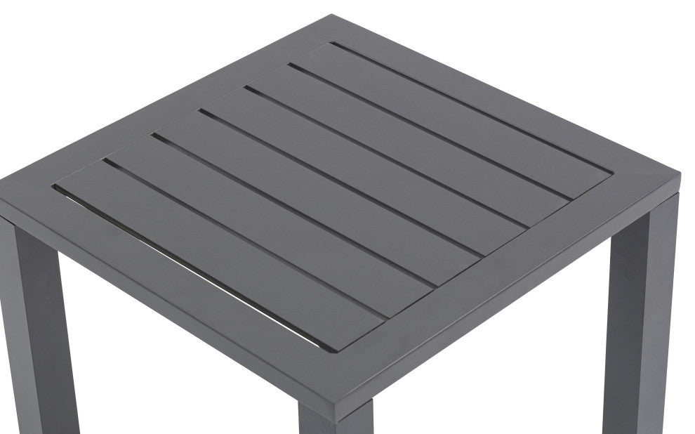 Bring the comfort of the indoors to your outdoor space with this Maldives outdoor end table. This beautiful table features a grey aluminum frame with quality construction, so you can count on it weathering the outdoors without skipping a beat. Adding these to any space will give it a definitive resort appeal.Overall Product Dimensions: 16.5" W x 16.5" D x 17.5" HOutdoor Patio End/Side TableDark Grey AluminumContemporary Design