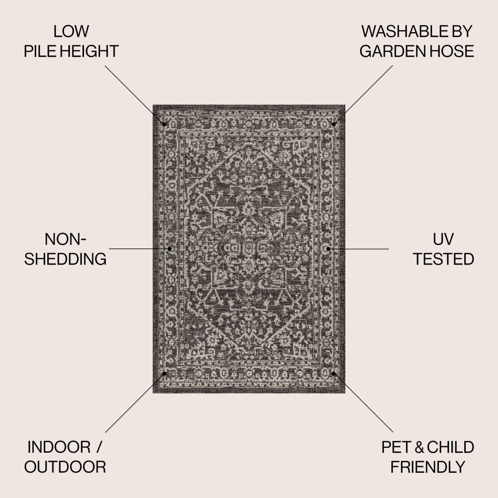 This colorful medallion rug adds rich Bohemian style to an outdoor porch or patio. Varied tones of black mingled with a light gray pattern give this rug a hand-woven, vintage vibe. The flatweave design is great for high-traffic spaces indoors too.Features:• Flat-weave construction of 100% polypropylene• Black and gray with a handwoven mingled texture• Water resistance with 0.19" pile• 100% Polypropylene• No backing, use of rug pad is recommended (sold separately)• Power Loomed in Turkiye• Actual Dimension: 6 ft. x 9 ft.• Color: Black/Gray• Thickness measures: 0.19 in.• Available in multiple sizes and/or colorsRug Care:• Vacuum regularly and spot clean as needed; avoid direct and continuous exposure to sunlight; use brushless vacuum; remove spills immediately; if liquid, blot with clean, undyed cloth by pressing firmly around the spill to absorb as much as possible; for hard to remove stains, professional rug cleaning is recommended; store in a dry, well ventilated area and rotate for consistent wear• Packing and shipping may cause temporary creases in rugs, which will flatten out after a week on the floor; to expedite the process, try back-rolling your rug before laying it down, and then allow ample time for the remaining creases to relax• Please Note: Due to differences in monitors, some rug colors may vary slightly. Lengths and widths may vary from the published dimensions. Patterns may vary slightly according to shape and size selected.About us:Style your floors with JONATHAN Y. By combining fine craftsmanship and design, this New York creative studio is bringing fashion to your floors. The collection mixes sustainable organic materials, vibrant colors and trend worthy styles to create JONATHAN Y''s distinctive catalog of rugs.