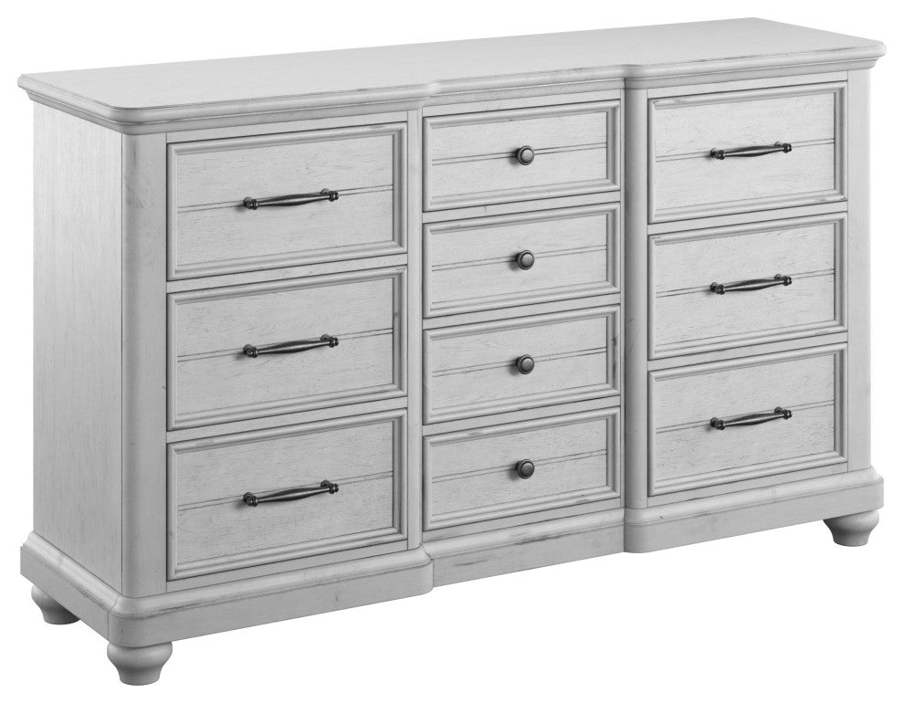 Grand in scale but casual in feel, this dresser is an easy winner decorated with classic arches, scored fronts, and turned wood details. The oyster shell finish with light distressing lends a weathered appearance that pairs with charming antique pewter pulls and knobs for a seaside look. Make your home feel like summer year-round with the charmingly coastal dresser.