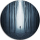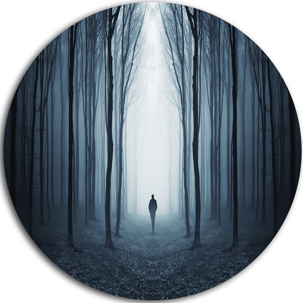 Bring Contemporary Abstraction to your home with this large Circle Metal wall art. This Man Walking Along in Misty Forest Metal Artwork makes it the focal point of any room or office.