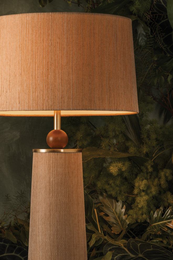 A blend of materials and contrasting shapes creates high textural interest and intriguing geometries in the January table lamp. The shape, as sketched by Mandy Cheng, includes a slender tapered base, large drum shade, and decorative ball resting in between. The harmony between the natural woven shade, matte walnut wood, and metal elements creates multiple highlights in this artistic table lamp.