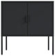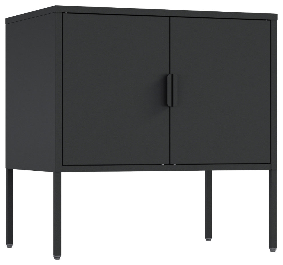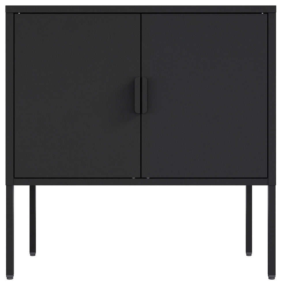 - Features 2 Standard Metal Doors with Vertical Metal Handles.