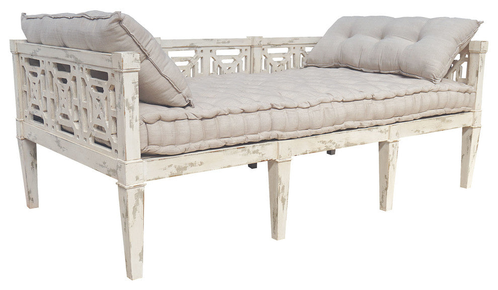 Crossroads European White finish on carved mahogany day bed. Tufted cushion and pillows.