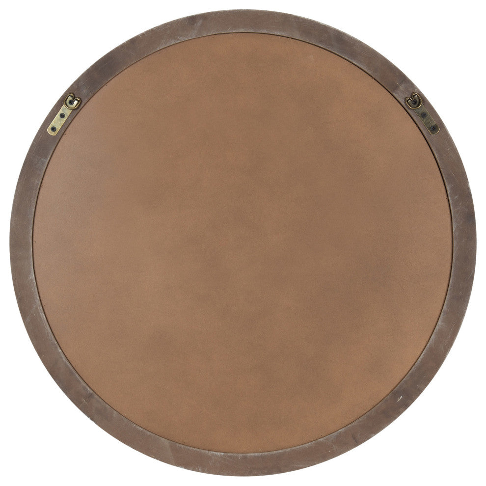 Make a bold and sophisticated statement on your wall with the beautiful transitional style of the Mansell decorative wall mirror. A well-built, ornamental wooden frame borders the round circular-shaped glass mirror. Its sophisticated, rustic brown-finished frame features a sloped style and has a durable, textured wood construction. Hang this lovely statement piece proudly over your vanity, dresser, shelf, or hang it as an accent piece in the living room, dining room, family room, or bedroom. The shape will be a great way to break up the straight lines of a gallery display or just the right size for smaller wall space. No matter the setting, the Mansell is sure to add a charming visual appeal to any room. The outside diameter of this round mirror is 28 inches. The actual mirror is 24 inches in diameter. Hang your new Mansell wall mirror quickly with the metal D-ring hangers securely attached to the back of the wooden frame.