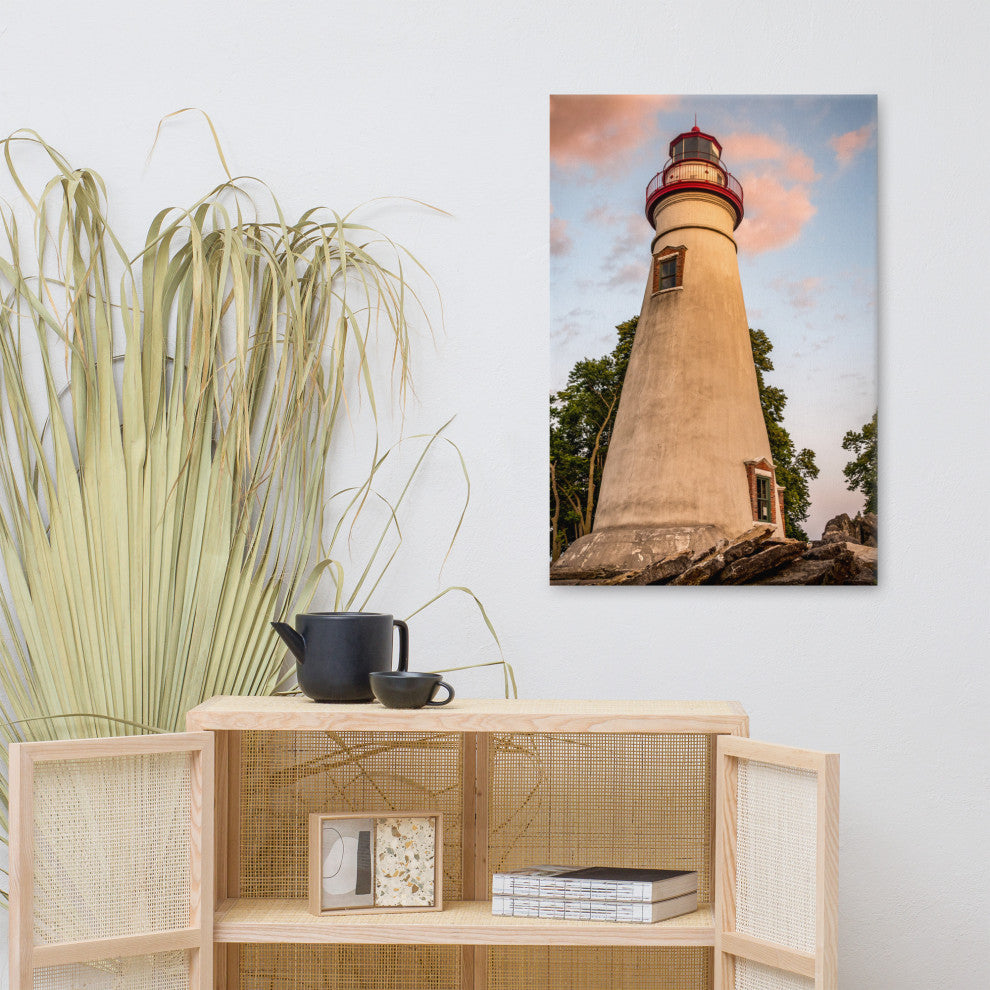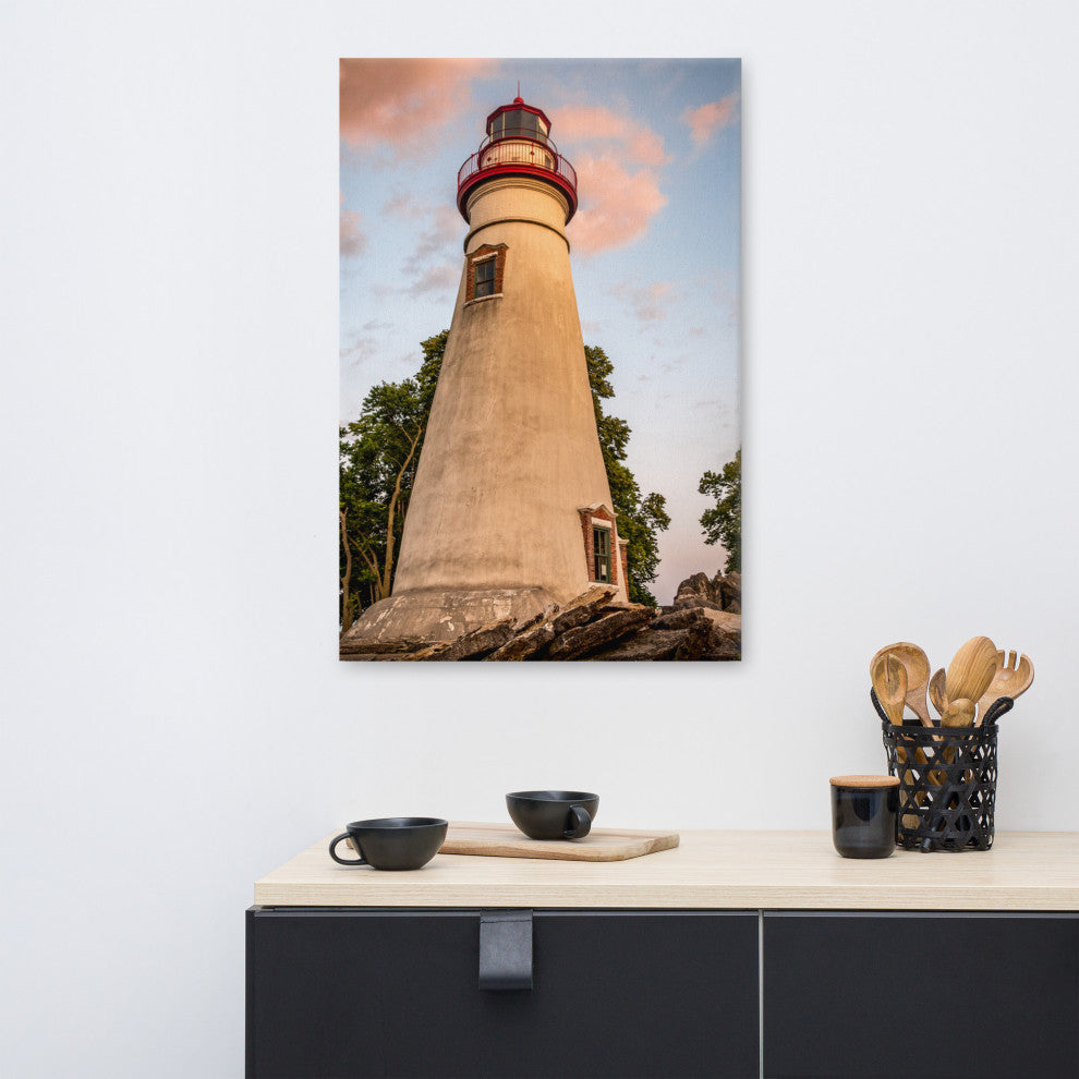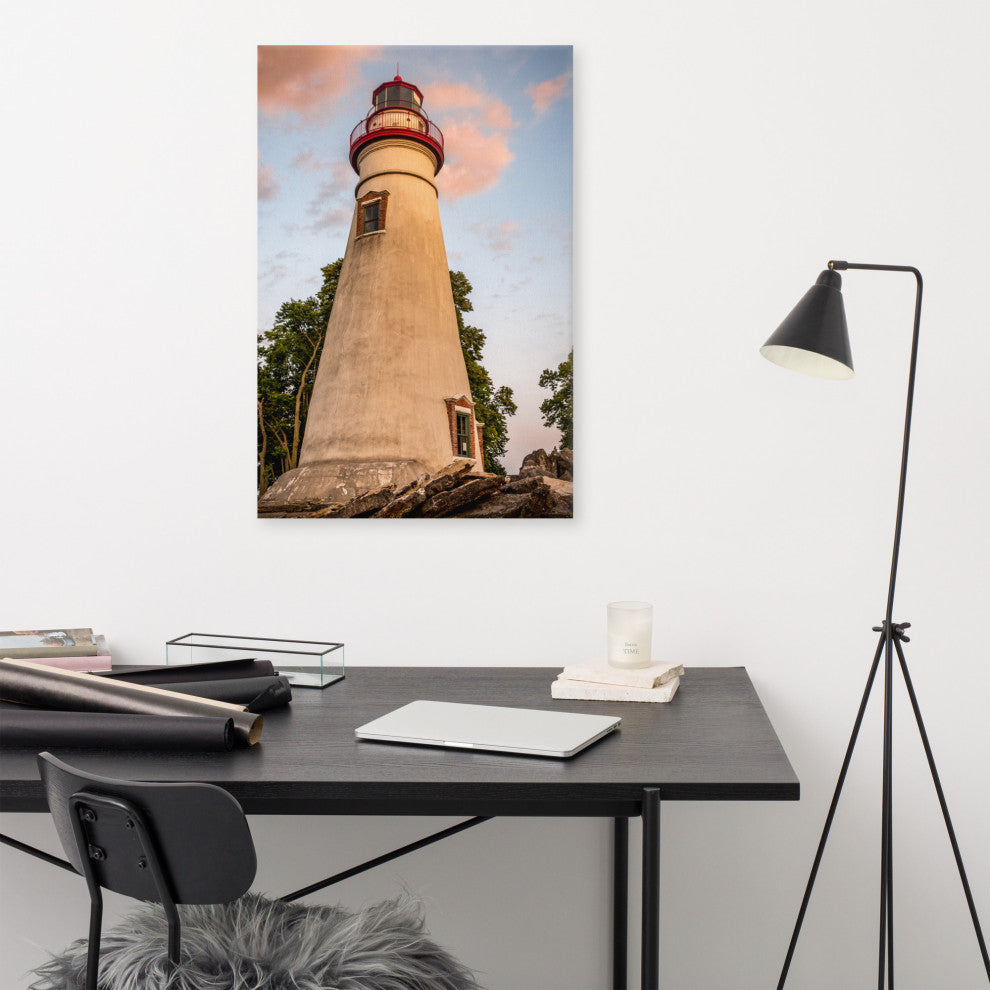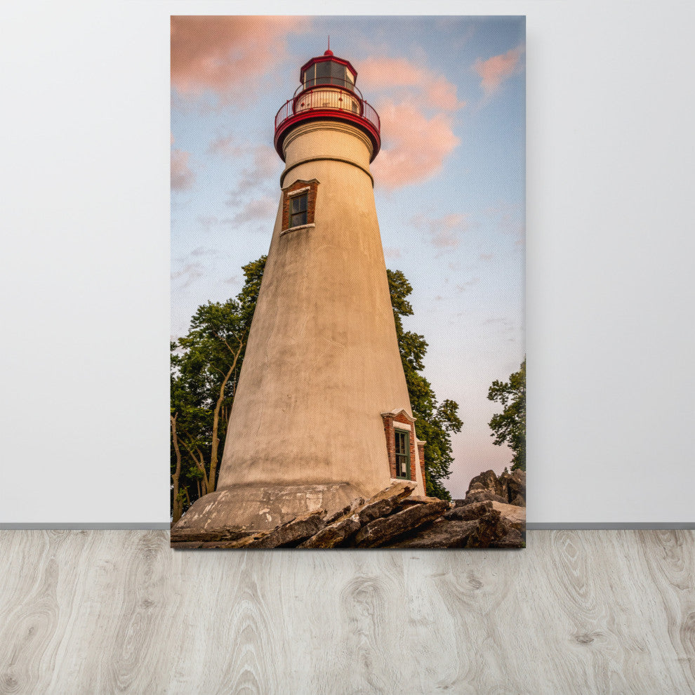 Marblehead Lighthouse at Sunset - Nautical / Maritime / Beach / Coastal / Seascape Nature / Landscape Photograph Canvas Wall Art Print - Artwork - Wall DecorLooking to add a little flair to your wall in your living room, bedroom, dining room or office? Look no further than these classic canvas gallery wrapped wall art prints. Come check out the options of these fade-resistant prints that you''re bound to fall in love with at an affordable price.Photo Information:About This Beach Scene: A dramatic Indian Summer sunset of pink clouds over the Marblehead Lighthouse located in Marblehead Ohio; part of the Marblehead Lighthouse State Park. This photograph was taken from the rock slate that makes up the shore base under the lighthouse and photographed upwards to give the lighthouse a more powerful look against the soft colorful sky. Marblehead Light is the oldest lighthouse that is in continuous operation on the United States side of the Great Lakes and was built in 1822. Title: Marblehead Lighthouse at Sunset From the ShorePhotographer: Melissa FagueGenre: Landscape PhotographyItem ID#: LAND-0143Main colors of this photograph: White, Blue, Pink, Gray, Brown, RedAdd a touch of natural beauty to your home or office with our canvas wall art prints. Each photograph is printed on a high-quality poly cotton blended canvas, ensuring vibrant colors and sharp details. The print is then hand stretched over a sturdy wood frame, giving it a sleek and modern look. With its matte sheen finish, this wall art adds a sophisticated touch to any room.Not only is the print visually stunning, but it is also built to last. The materials used are fade-resistant, ensuring that the colors stay vibrant for years to come. The acid-free and PH neutral canvas base guarantees that the print will not yellow or deteriorate over time.Installing this wall art is hassle-free. It comes with all the necessary hardware, including mounting brackets, making it easy to hang on your wall. The 1.25" deep canvas structure adds depth and dimension to the piece. Transform your living space with our canvas wall art print. Its timeless design and durable construction make it a perfect addition to any home decor style.Print Material: Acid-free, PH neutral, poly-cotton base, fade-resistant (OBA-free) / 20.5 mil thick canvas / Canvas Structure: 1.25" deep / Hand assembled solid wood stretcher bar frame / Mounting brackets included.Environmental Impact: Responsibly sourced and manufactured in the USA / Printed on demand (Made-To-Order) and shipped directly to you. Making products on demand instead of in bulk helps reduce overproduction, so thank you for making thoughtful purchasing decisions! Artwork Ships: Normally within 2-3 business days.Recommended for indoor use only unless you (DIY) waterproofing (Please note: This print is not returnable if alterations were made)Suitable rooms for this art print: Offices, nurseries, living rooms, bedrooms, bathrooms, family rooms, man caves, dorms, dining rooms, kitchens, classrooms, apartments, bars, baby nurseries, home offices, spas, meditation rooms, hallways, stairways, guest rooms, healthcare facilities, corporate offices, hotel decor, home staging, interior decorating, lobbies, waiting rooms,Great gift ideas for: women, wife, girlfriend, her, girls, daughter, grand-daughters, men, guys, boys, son, husband, boyfriend, him, kids, teens, best friend, Christmas, Xmas, holiday, Halloween, housewarming, affordable presents, bridal shower, wedding, birthday, anniversaryProcessing And Shipping:This canvas artwork is made especially for you as soon as you place an order, which is why it takes us a bit longer to deliver it to you. Making products on demand instead of in bulk helps reduce overproduction, so thank you for making thoughtful purchasing decisions!Returns: Super simple! No hassle return or exchange policy. You"™ll receive 100% money back if you"™re not satisfied...simply message us.