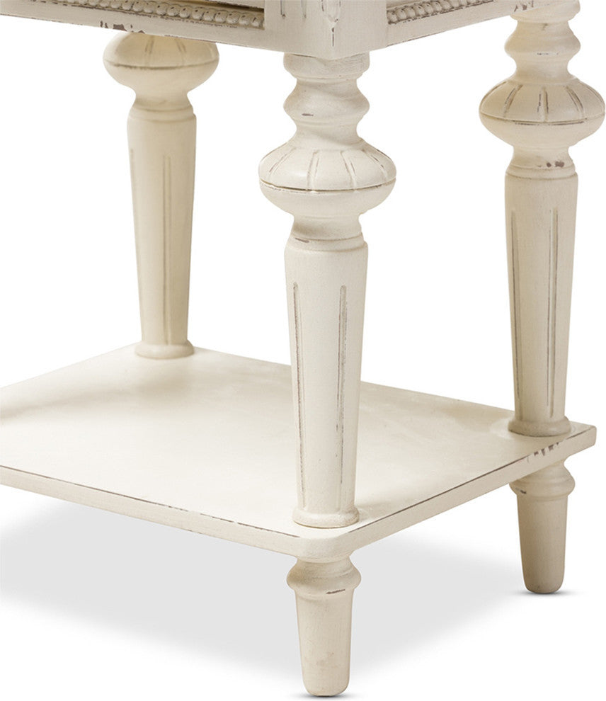 Traditional and contemporary elements work together in the Marquetterie French provincial style nightstand, giving it a timeless elegance. The gorgeous provincial design elements have been delicately restored and finished with a rustic iron handle, weathered oak wood top and distressed white polish. This bedside table with two drawers and one shelf works beautifully as a side table in the living, entry, hallway, in addition to the bedroom. The neat proportions of this bedside table make it a functional piece for smaller spaces. The meticulously carved French fluted legs and corners and the frame details are paired beautifully with a classics white distressed finish, giving a traditional style table a chic twist. Classical and functional, the Marquetterie nightstand is made in Indonesia. It requires assembly.