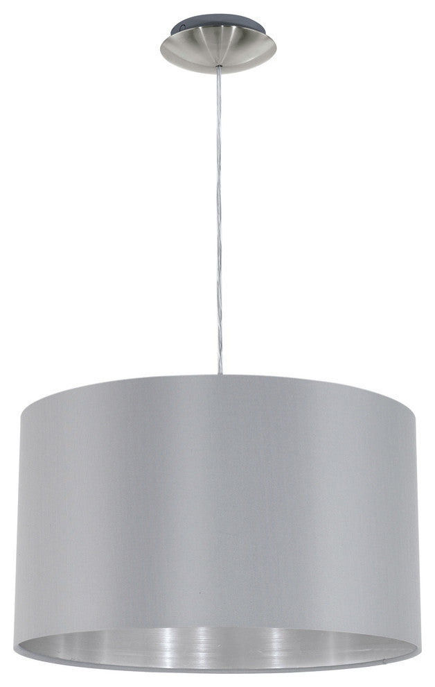The Eglo Maserlo Pendant light is a dazzling addition to any space with its unique contemporary design featuring a two-toned shade with a textured outer surface. With its field cuttable cord you can obtain just the right height to illuminate your space.PendantDrum PendantProduct Dimensions: 72"H (Diameter: 15")Shade Dimensions: 15"W x 8.62"HShade Material: FabricShade Color: Grey/Silver Shade Shape: DrumShade Included: YesShade Part: S-2408Canopy Measurments: 4 7/8" D x 1 1/4" HNumber of Bulbs Required: 1 Bulb(s)Bulb included: NoType of Bulb: A19Wattage: 60W (1x60W)Voltage: 120VBulb Shape: A19Bulb Base: E26Material Fixture Made of Steel, FabricBase Material: SteelFixture Finish: Satin NickelCable Color: TransparentSwarovski Crystal: NoIs Mounting Hardware Included: YesAssembly Required: YesScratch Resistant: NoRust Resistant: NoHardwiredSloped Ceiling Adaptable: YesMulticolor-Changing LED: NoField Cuttable Cord, Dimmer Compatible (Not Included)UL WET/DAMP LOCATION: DryLighting Type: ETLRoom Use: IndoorsWarranty: 1 Year