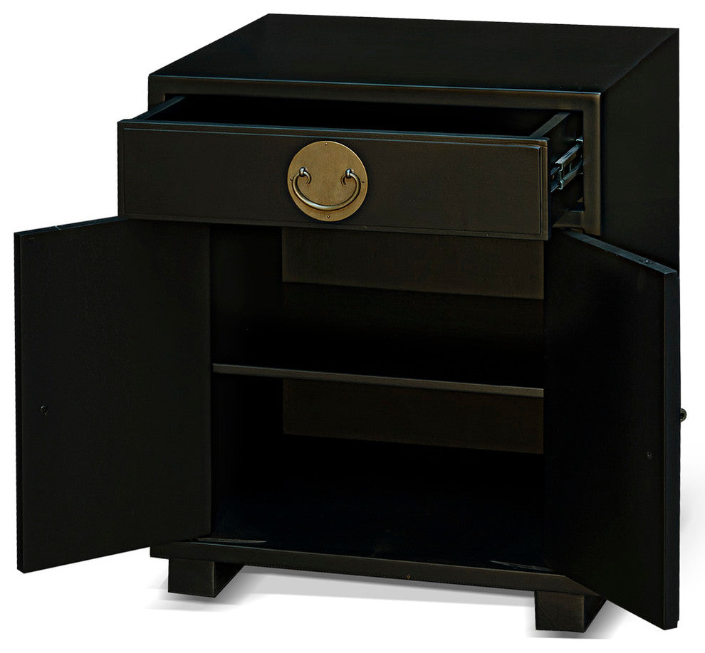 The Ming furniture style is characterized by its simple, clean, and pleasing lines. Our reproduced Elmwood Ming cabinet is a fine example of the spare and elegant design. The top drawer features metal slides for ease of use. Handcrafted by master artisans in China with hand-rubbed black finish. Brass matching Ming hardware decorates the entire unit.. This item will be shipped from Westmont, IL 60559 U.S.A Use: Cabinet, Storage Material: Elmwood, Brass Color: Black Finish Make: Hand-crafted, Hand-forged Origin: China Dimensions: W 22"/ D 18"/H 26" Weight: 68 lb Attributes: 1 Drawer, Double Door, Adjustable Shelf