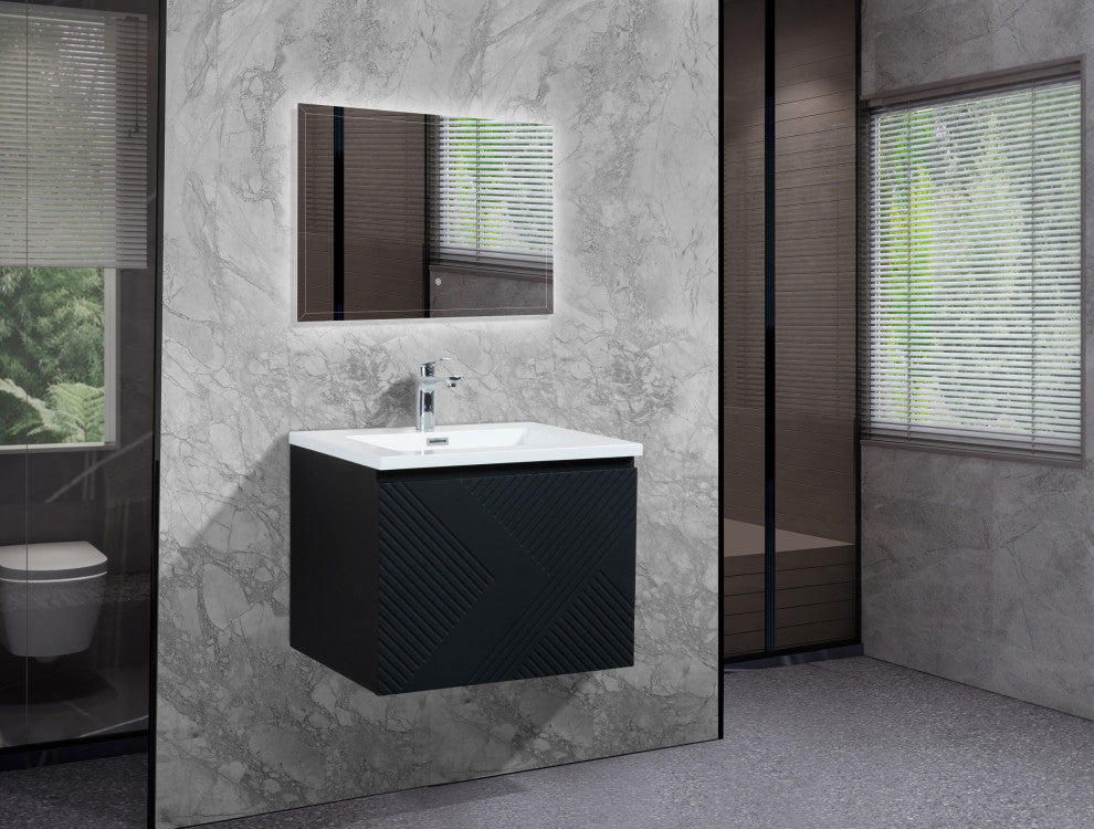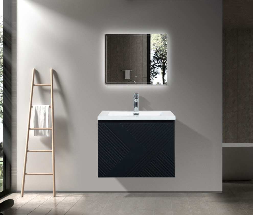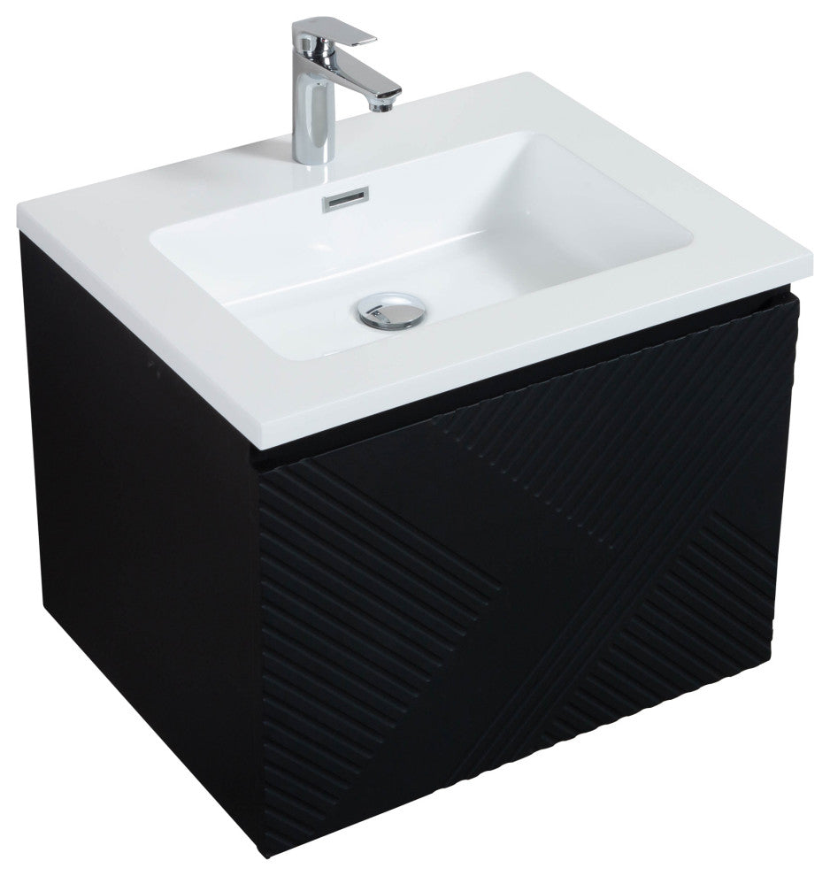 The Moore Contemporary simplicity of this floating vanity in a jet black finish will help open the space and add a stinning modern flair to your bathroom or powder room , The open space below amkes it easy to show off your tiles and to clean the floor . The big drawer with inner drawer reveals plenty of storage space .The clean lines that permeate through the design will surely create a fresh look in your home .FeaturesAvant-garde cabinet facadeJet black cabinet coordinates with matt black basinSlow- closing drawers and durable full extension slides that last a lifetimeErgonomic 45 degree invisible handle and uniquely designed handle area allow for a comfortable feel and effortless operationU-shaped drawer fitted around the plubming CabinetSize: 24" / 30" / 36" 40" / 48" / 60" Double 72" DoubleMaterial: MDFColor : Jet Black ( Matte Finish )Handle: 45 degree invisible jandle, The ergonomic design avoids accidental bumpsDrawer runners: Slow-closing drawer rail, Easy to open and close. Liberalize hands.Hanging system :H45Easy to install with minimal assembly requiredBasinType: Integrated sink Material : Solidsurface Color : Matt blackAny Mirrors, Faucets or Pop-Drains in the pictures are NOT included in the price.Vanity Dimensions: